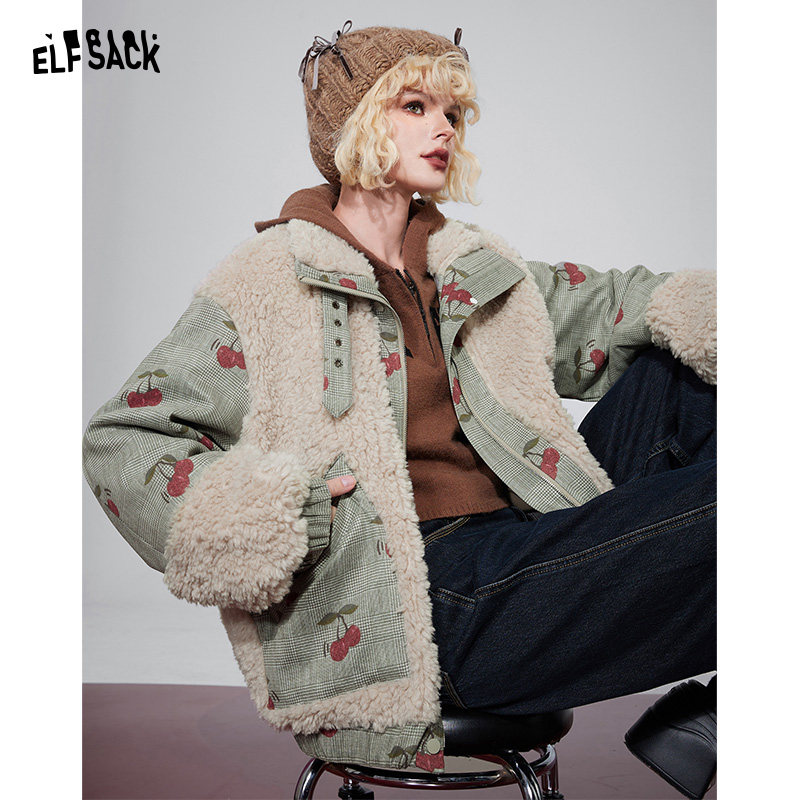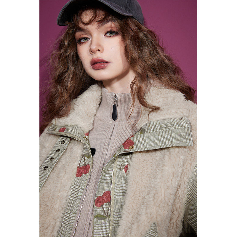 妖精的口袋格纹拼接麂皮绒外套女2025年冬新款仿毛绒毛呢新年穿搭