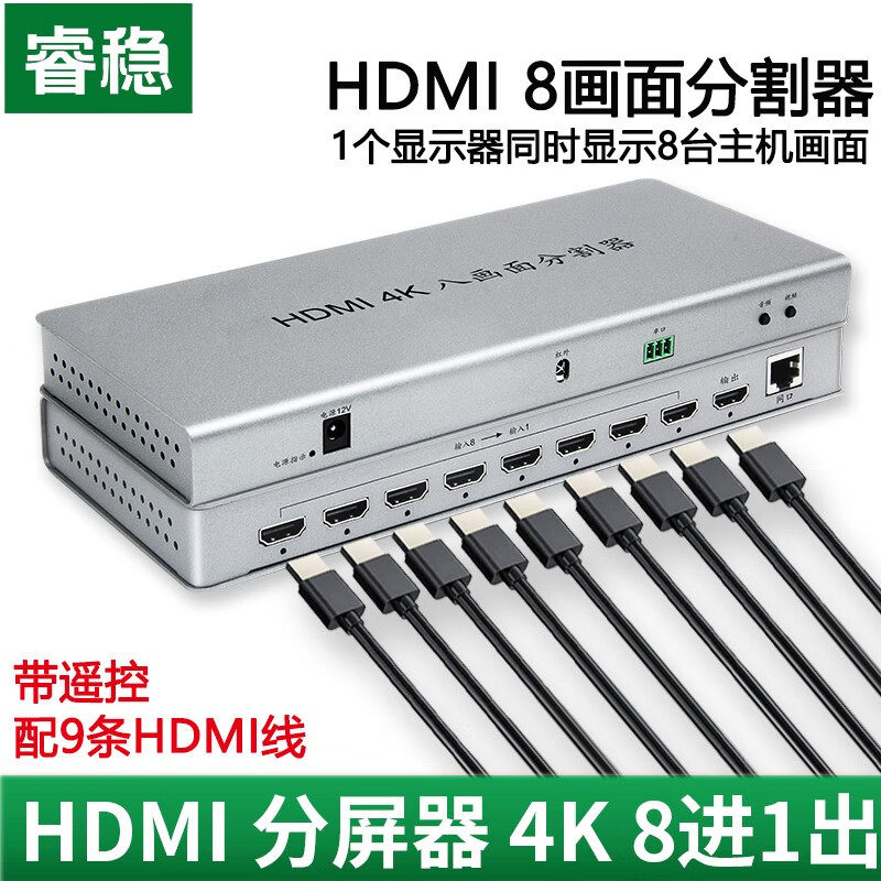 睿稳 分屏器八进一出8口4口画面分割器hdmi画面分屏器DNF地下城搬砖练级4k高清无缝切换器 HDMI 8画面分割器