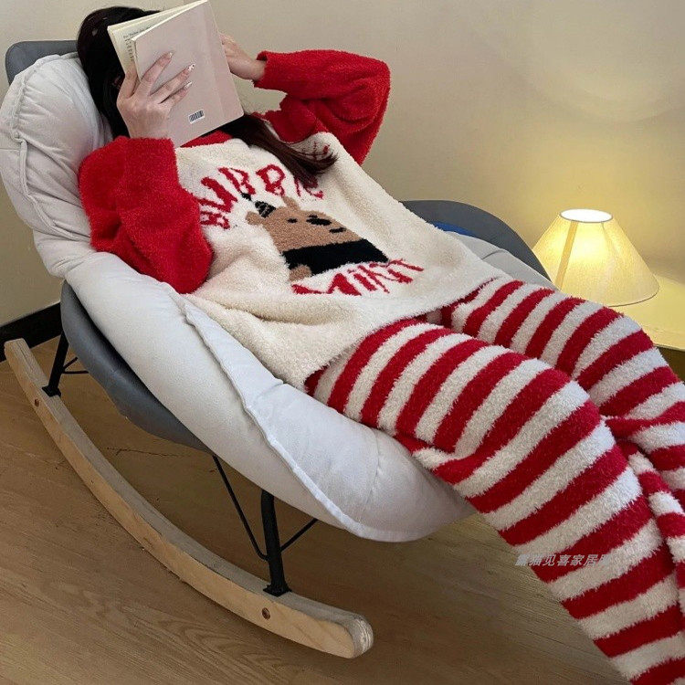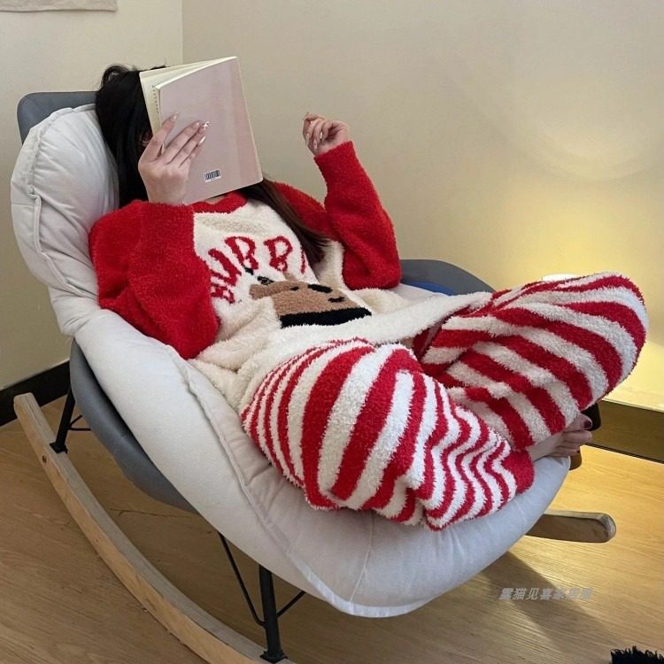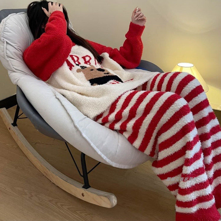 睡衣女冬天半边绒加厚珊瑚绒条纹红色ins新年套装圣诞春秋家居服