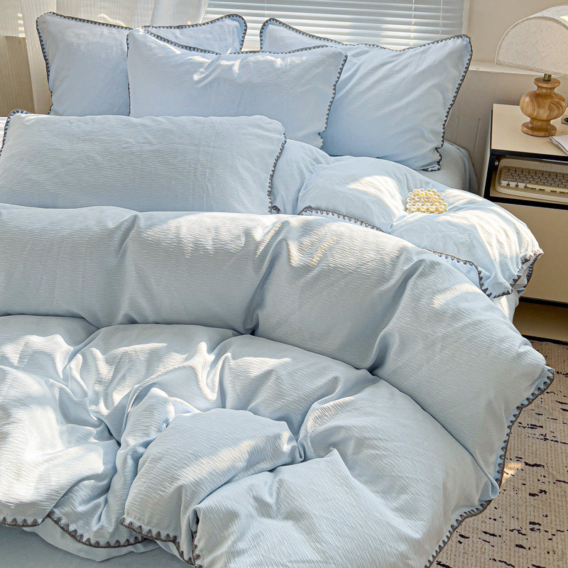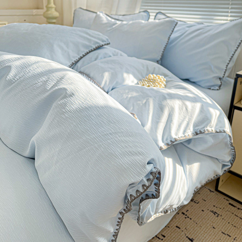 ins风奶油蓝四件套双层纱被套纯色床单宿舍床上三件套非全棉纯棉4