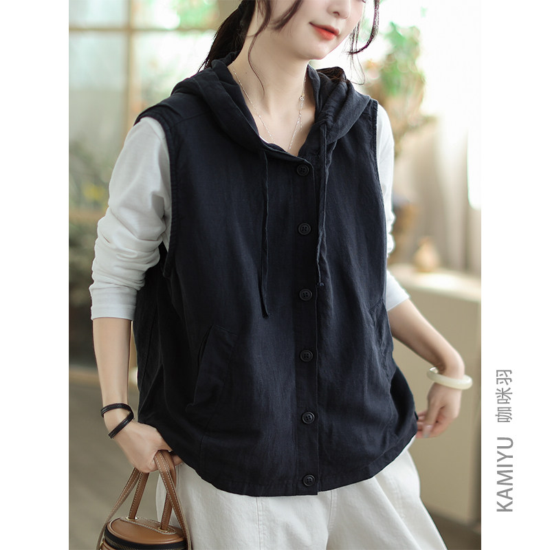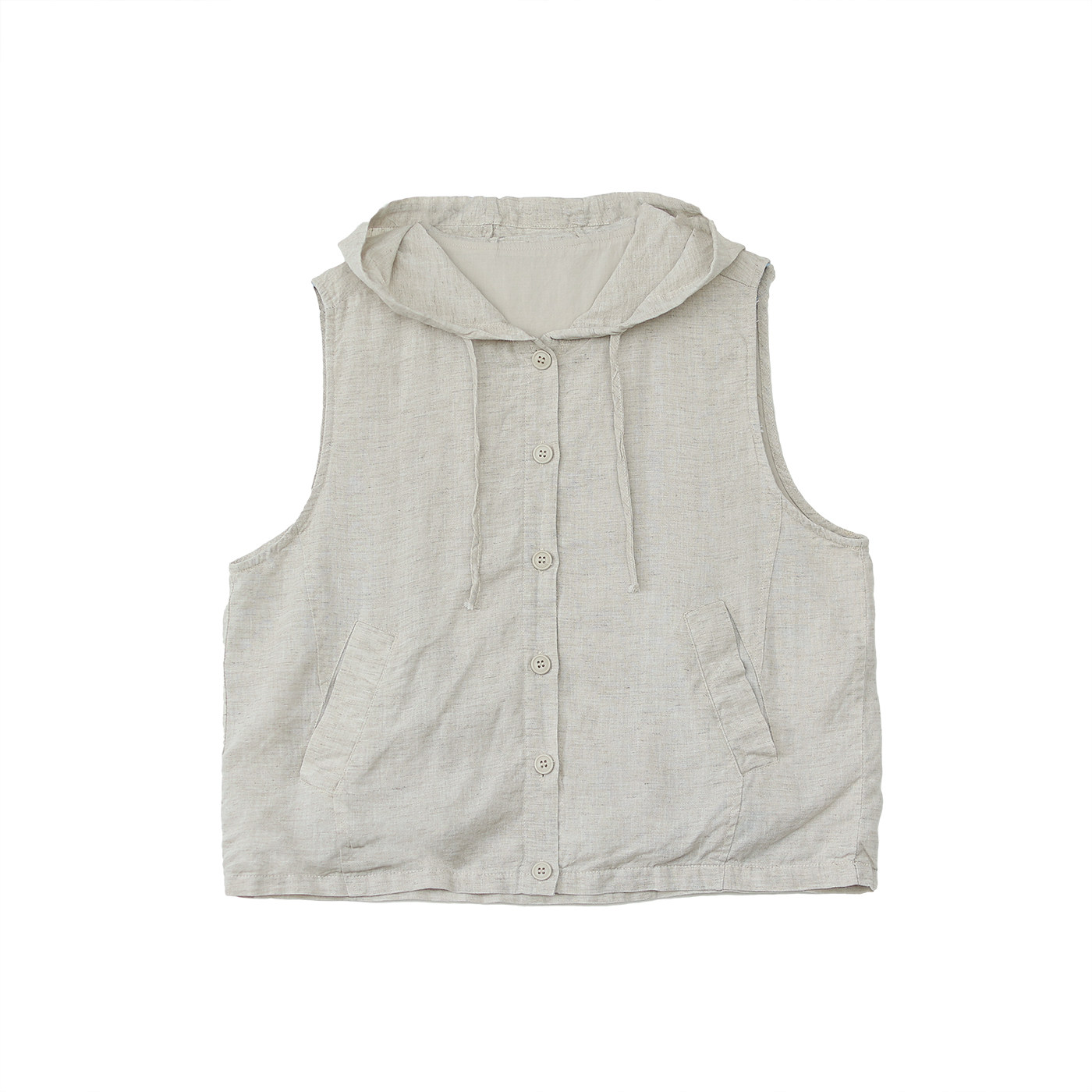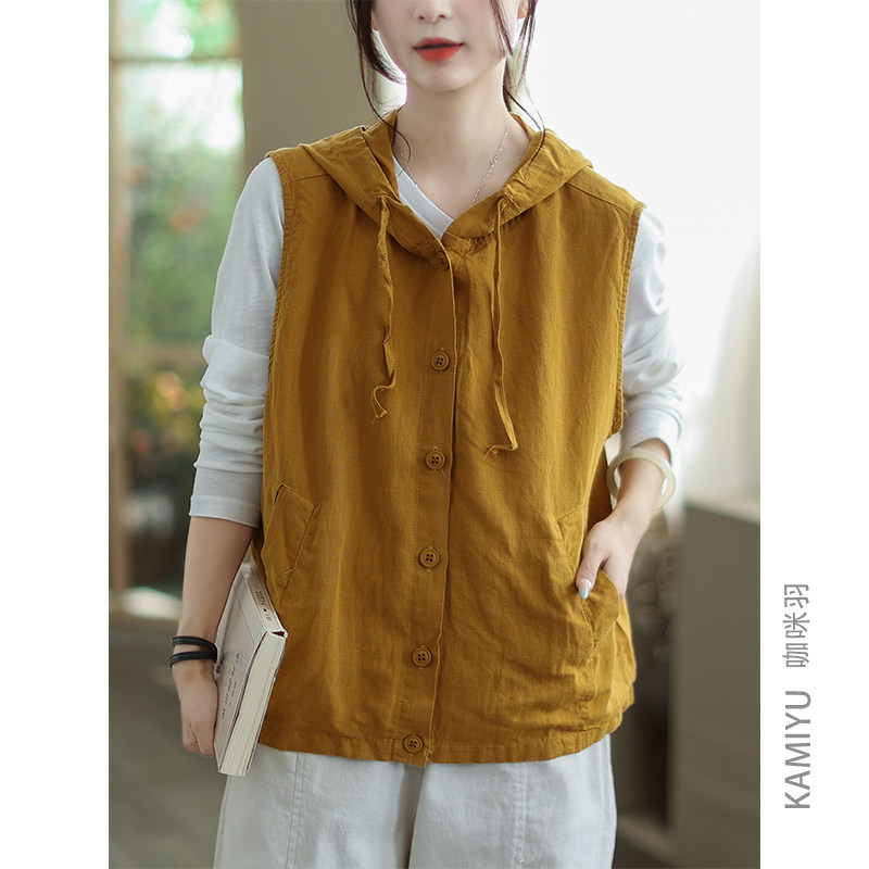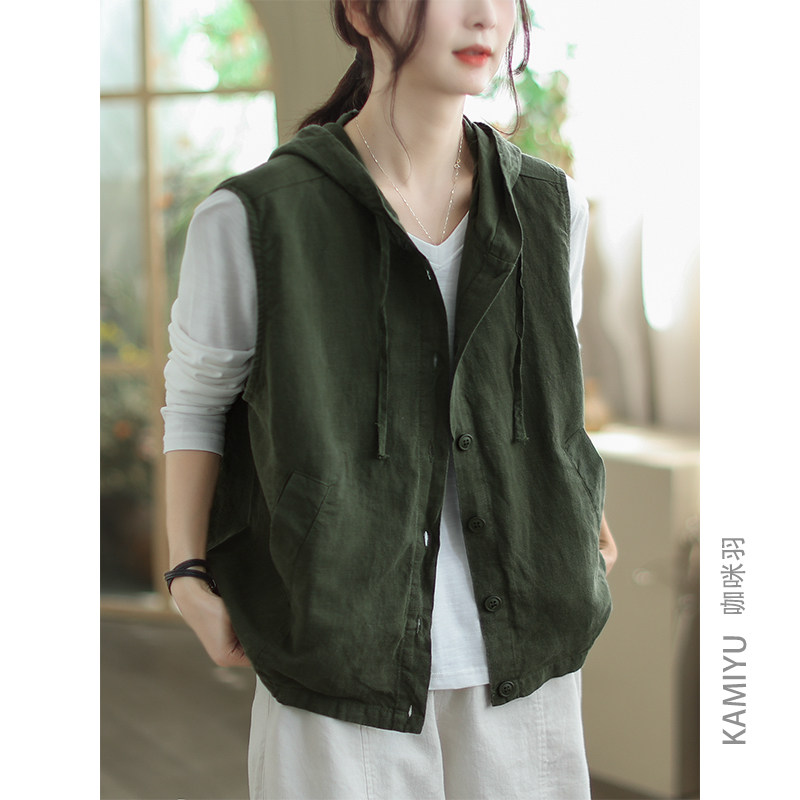 咖咪羽100%亚麻无袖马甲文艺纯色连帽马夹坎肩纯色外套