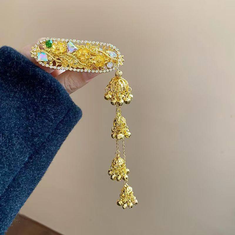 镶钻椭圆花朵铃铛流苏发夹民族风轻奢气质侧边鸭嘴夹精致轻奢发饰