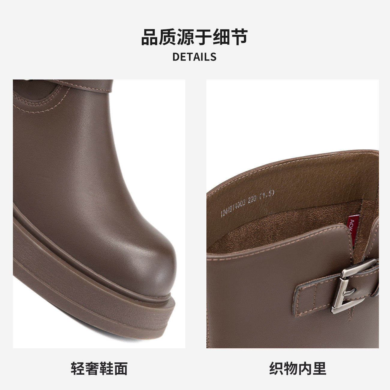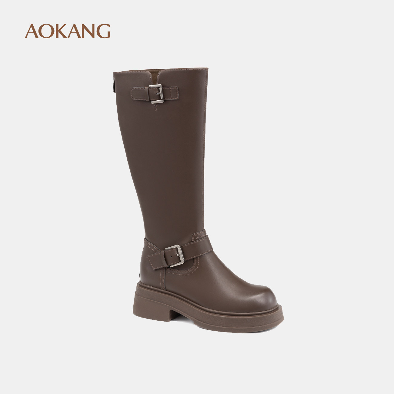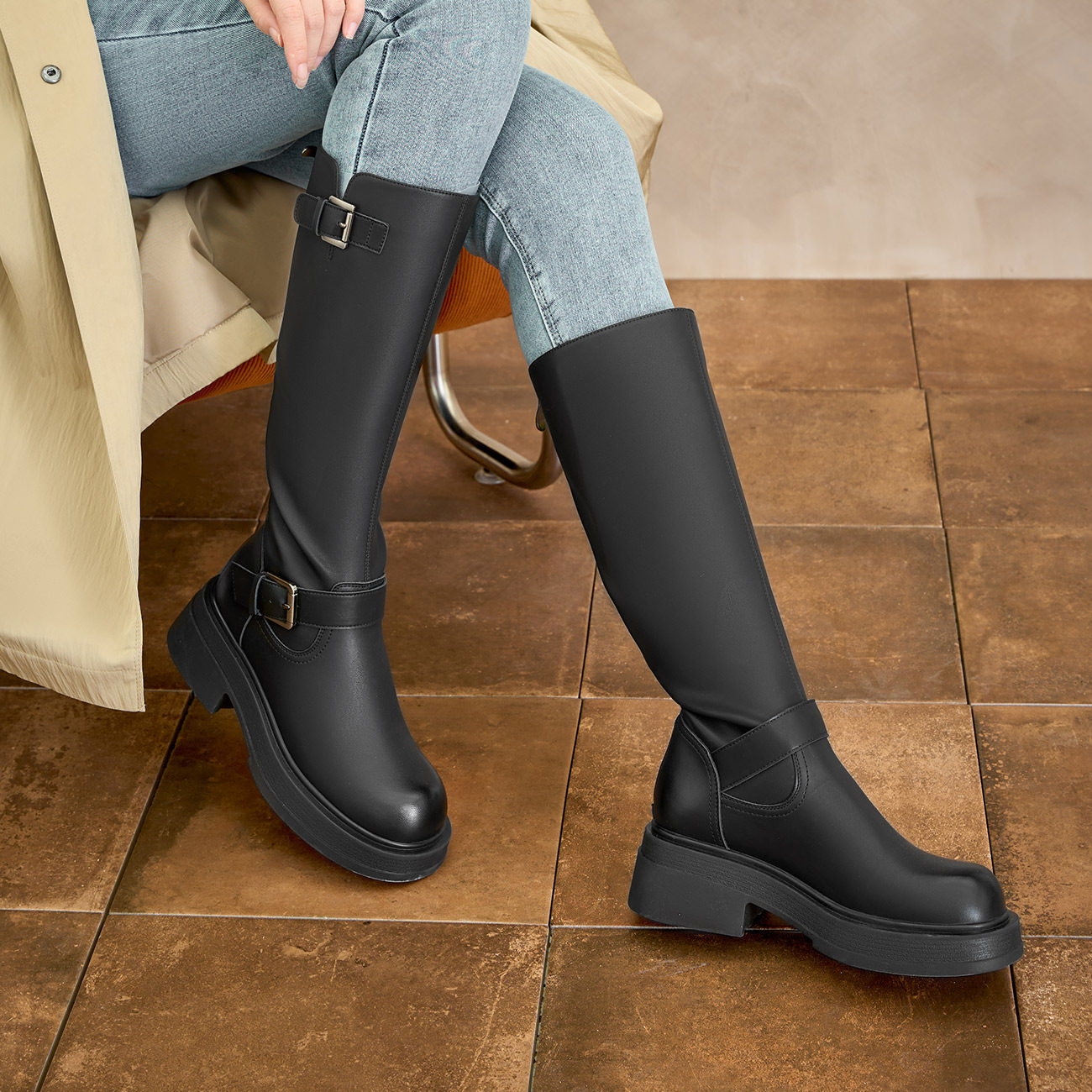 奥康 女鞋 冬季时尚休闲扣带机车靴长筒显瘦厚底骑士靴