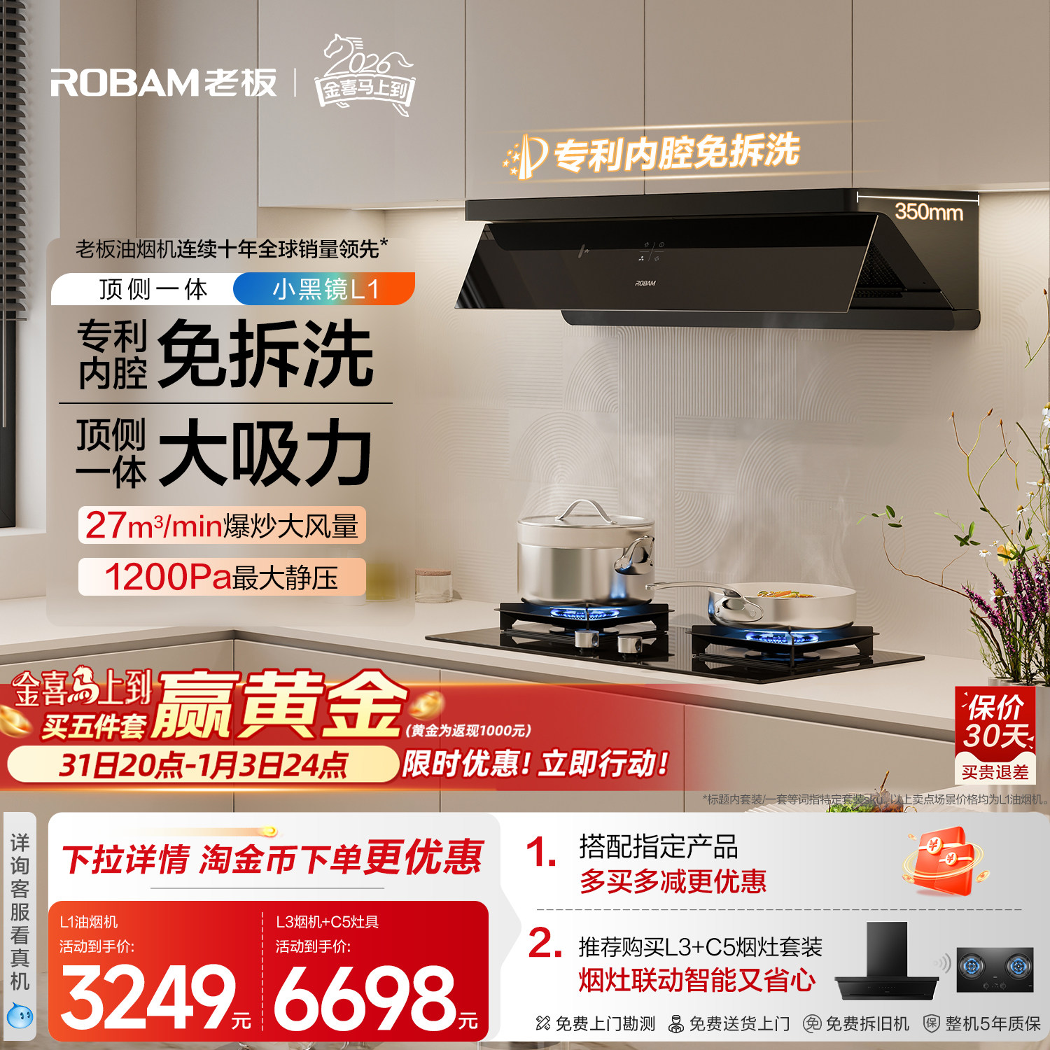 【顶侧一体】老板小黑镜L1/L3/L1mini油烟机燃气灶套装官方旗舰店