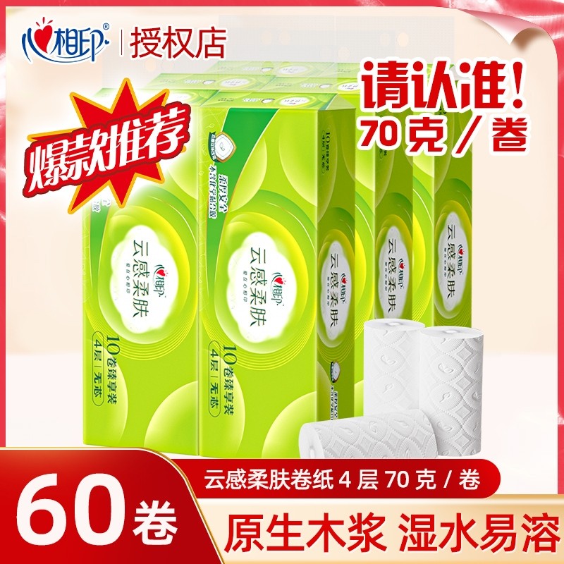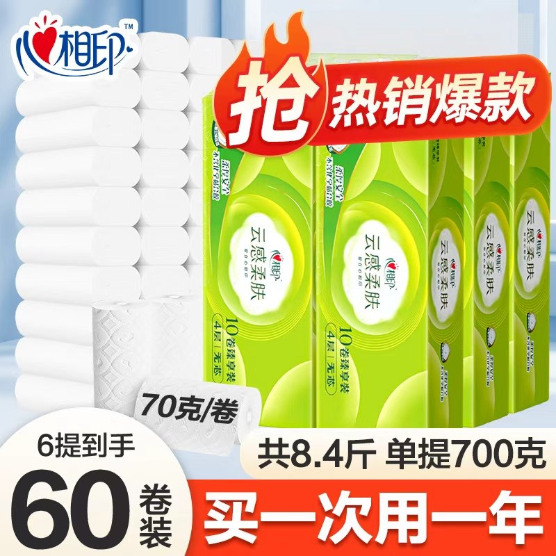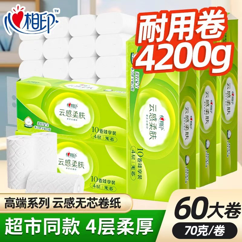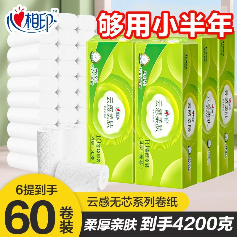 心相印卷纸无芯云感厚实立体压花厕纸家用卫生纸4层70克超厚批发