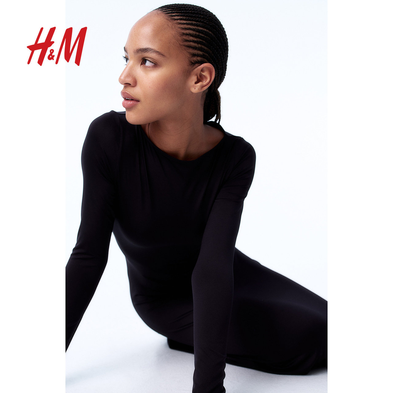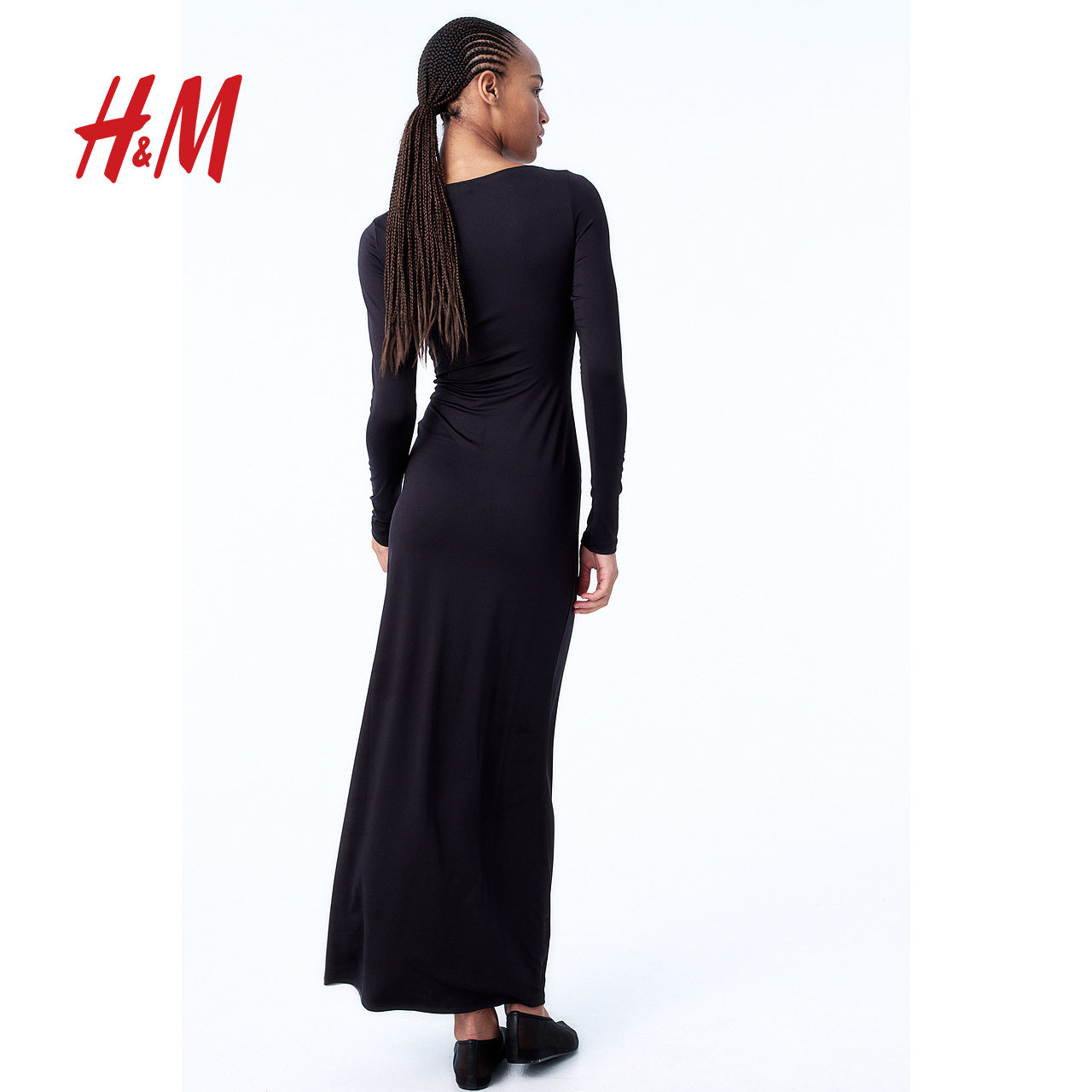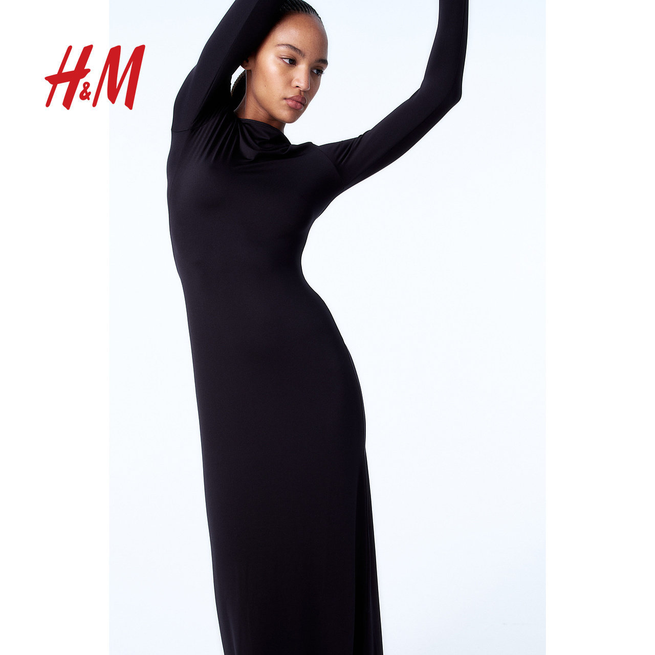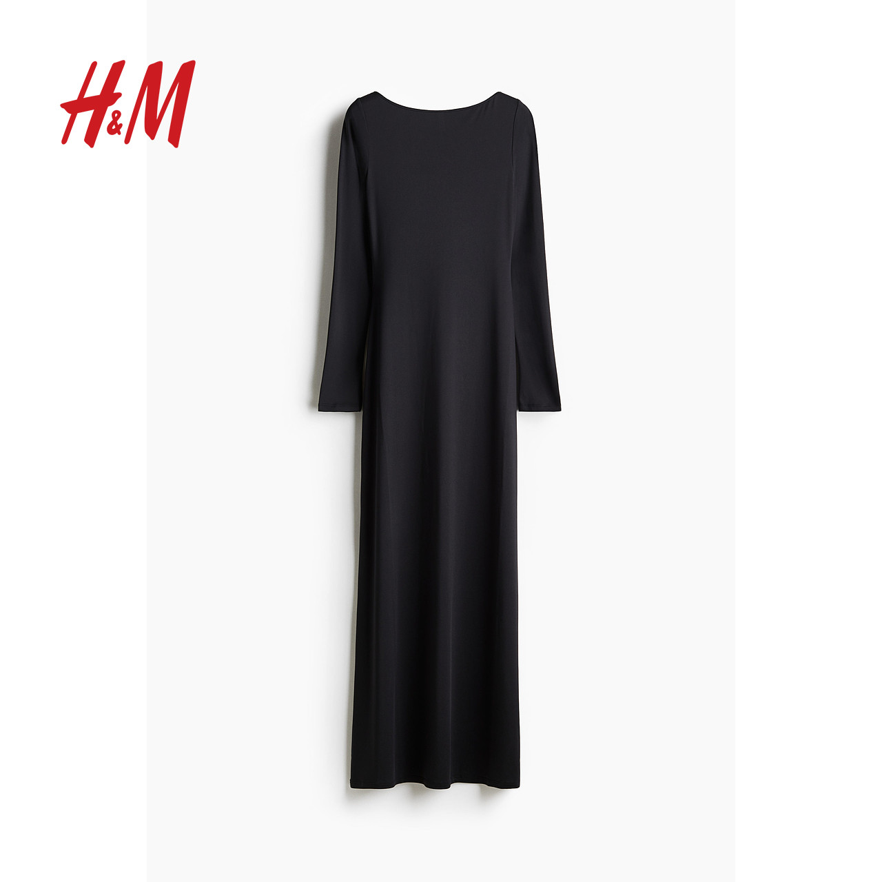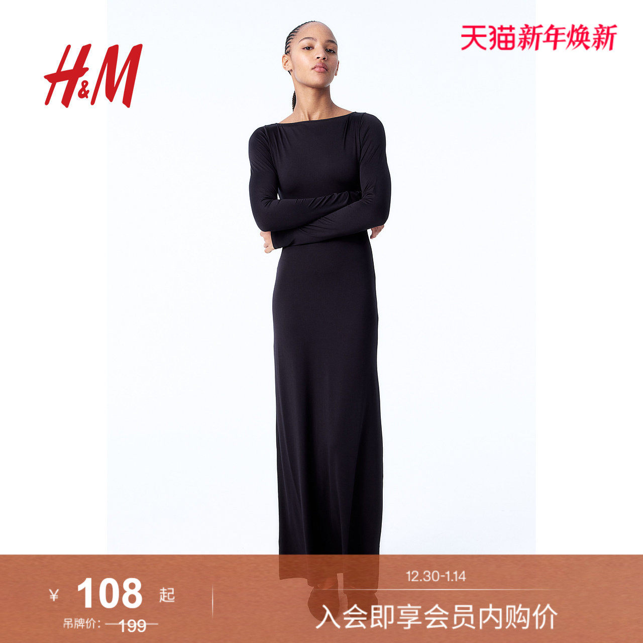 HM女装连衣裙冬季优雅气质一字领A字长袖长裙1246141