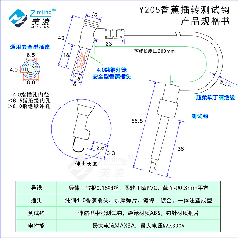 注塑安全型香蕉插头转测试钩线 数字万用表线 测试勾连接线 Y205