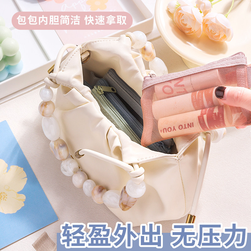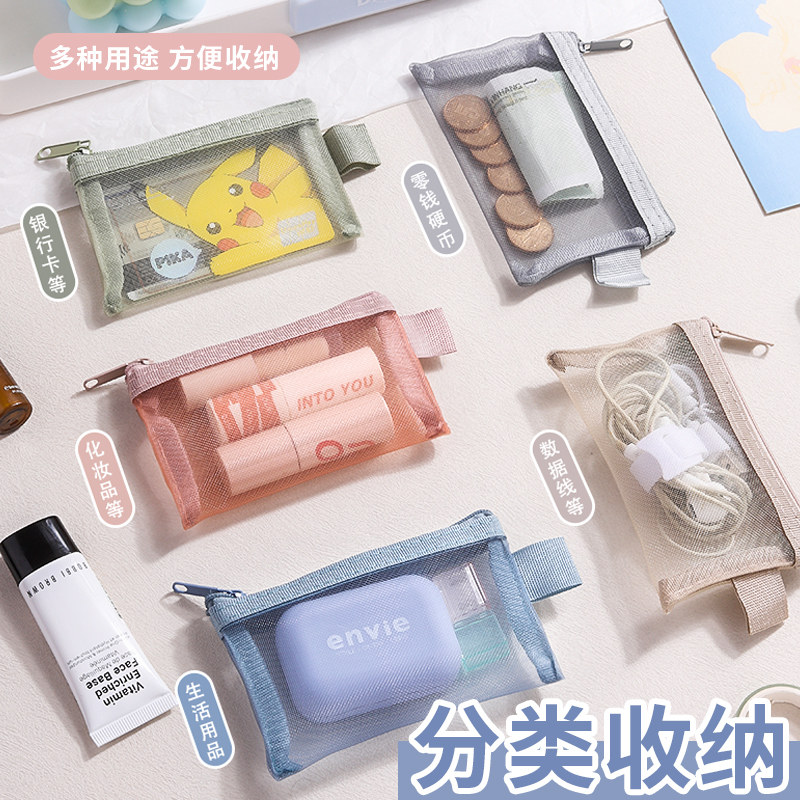 莫兰迪网纱透明收纳袋迷你分装网格袋加厚拉链小钱包文具袋分类小包便携公交卡零钱文件袋身份证硬币小巧卡包