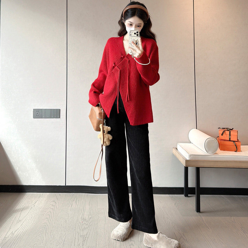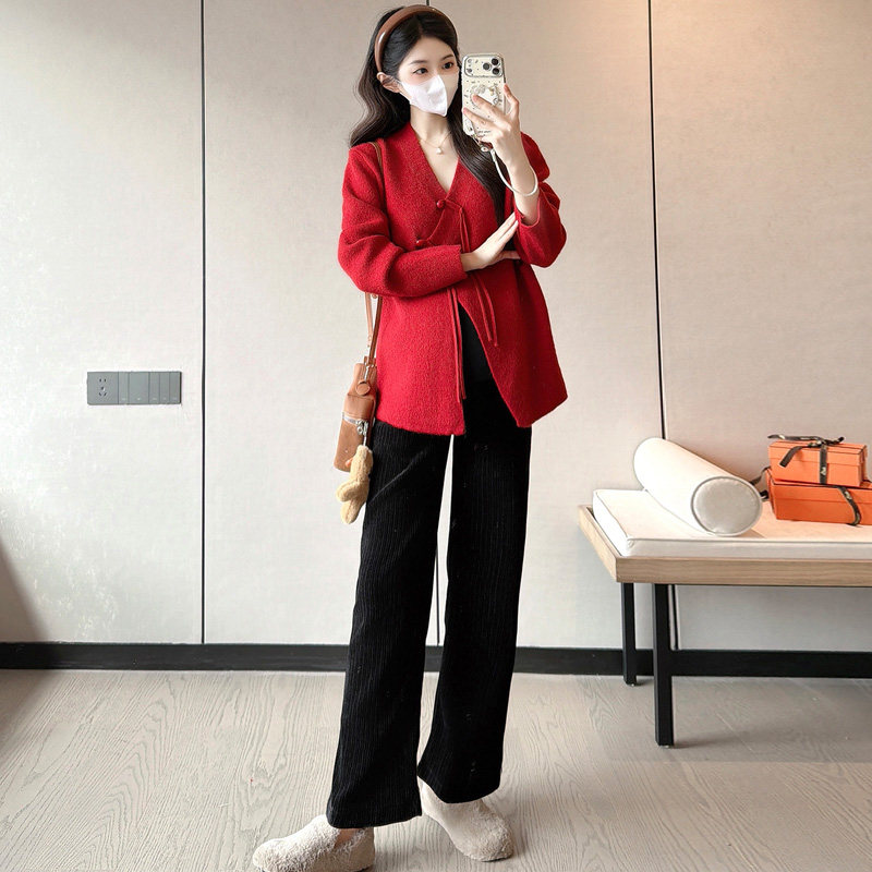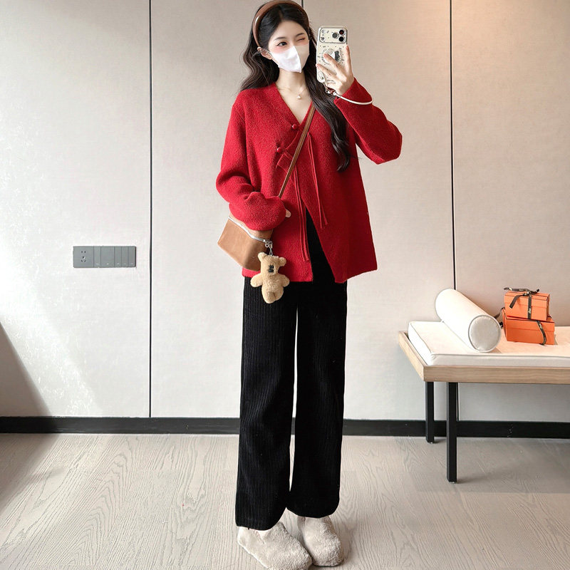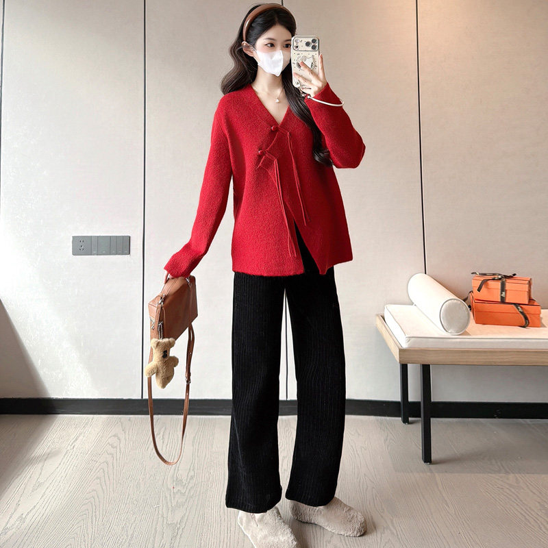 婧麒洋气孕妇装冬装孕期新款新中式红色针织毛衣裤子孕妇套装冬季
