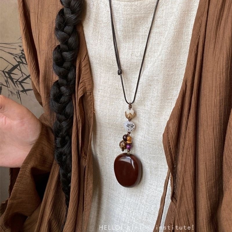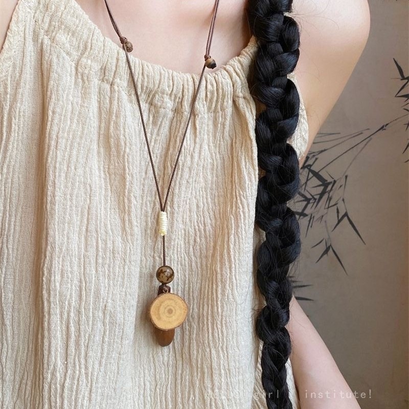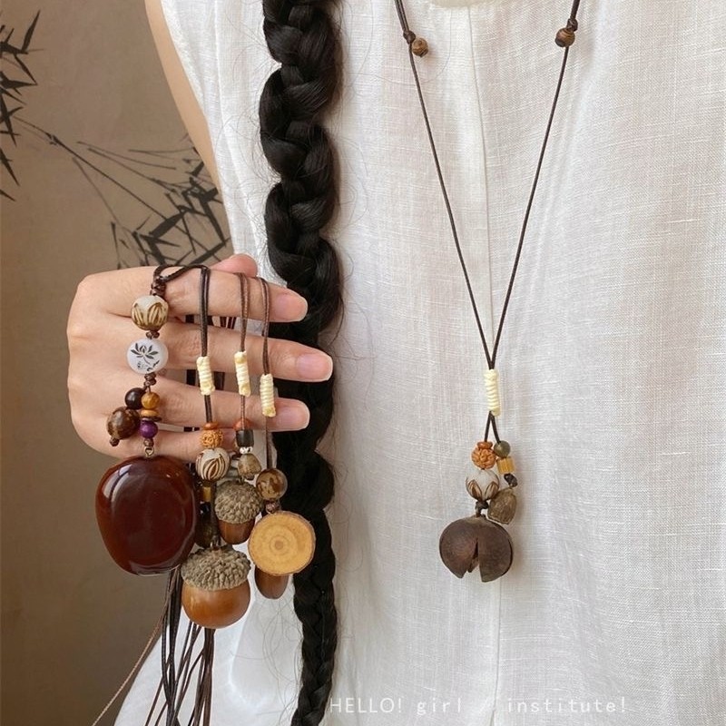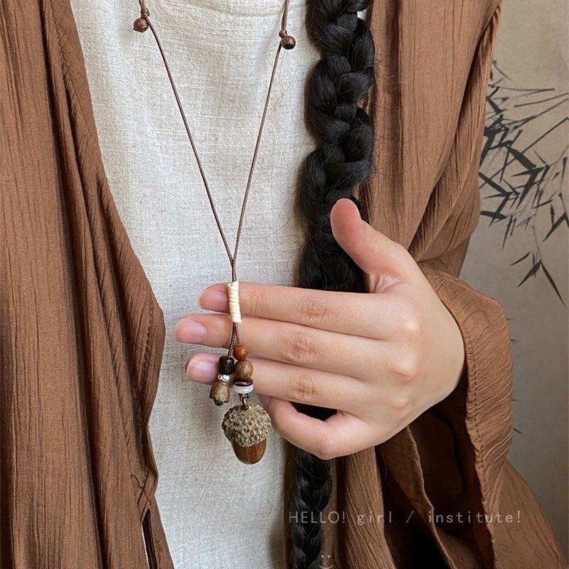 木质前调 国风长款蜡绳橡果吊坠项链新中式禅意设计感毛衣链配饰