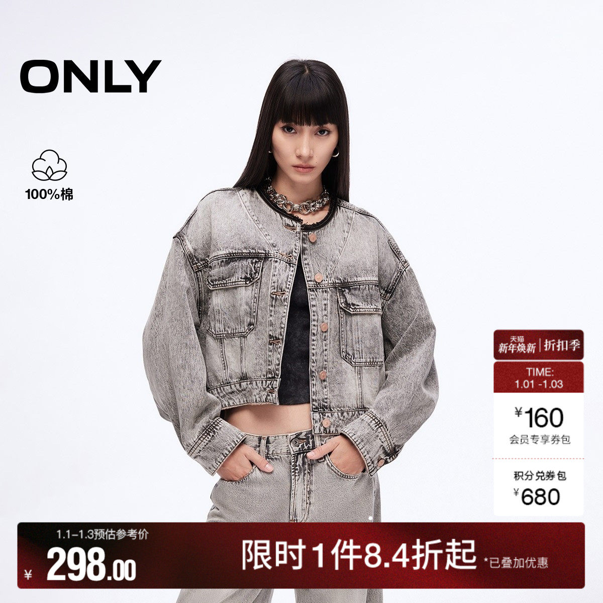 ONLY2025秋冬新款复古水洗个性毛边圆领宽松落肩短款牛仔外套女