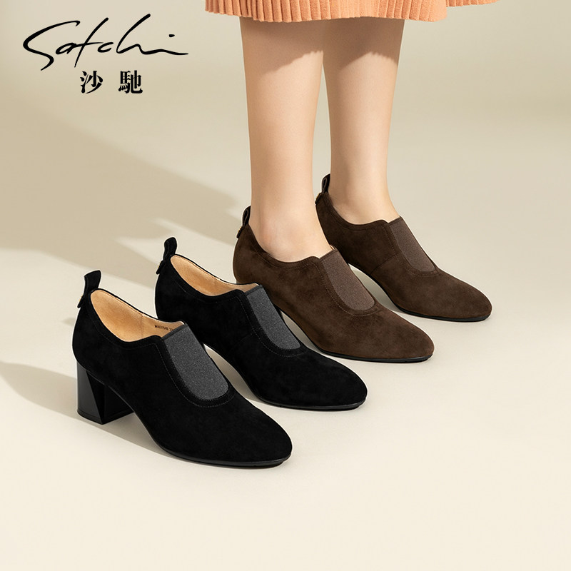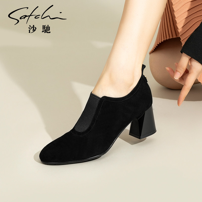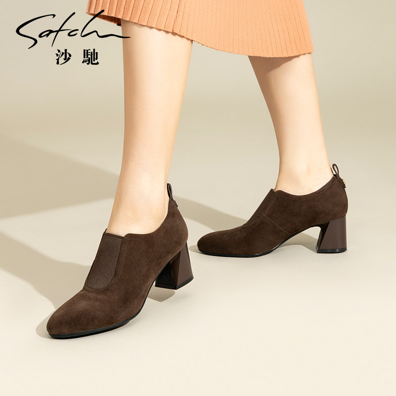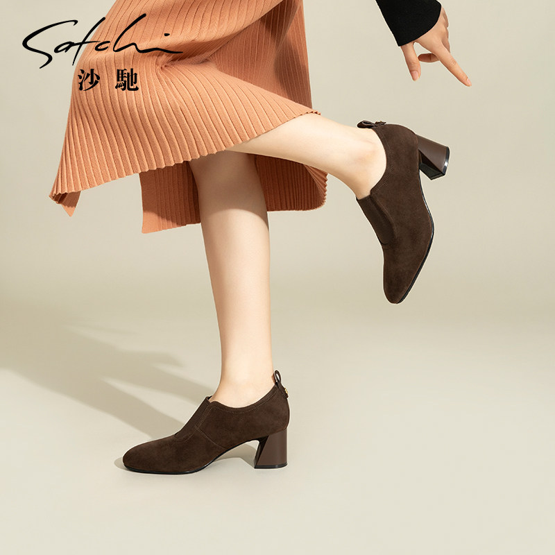 沙驰女鞋中跟粗跟羊皮单鞋女深口2025年秋冬新款时尚通勤时装靴