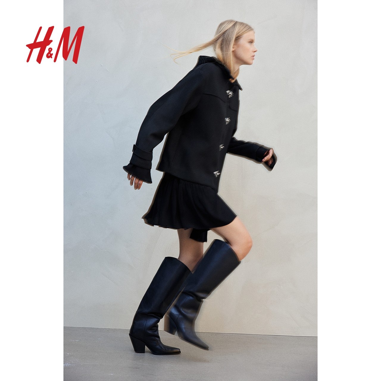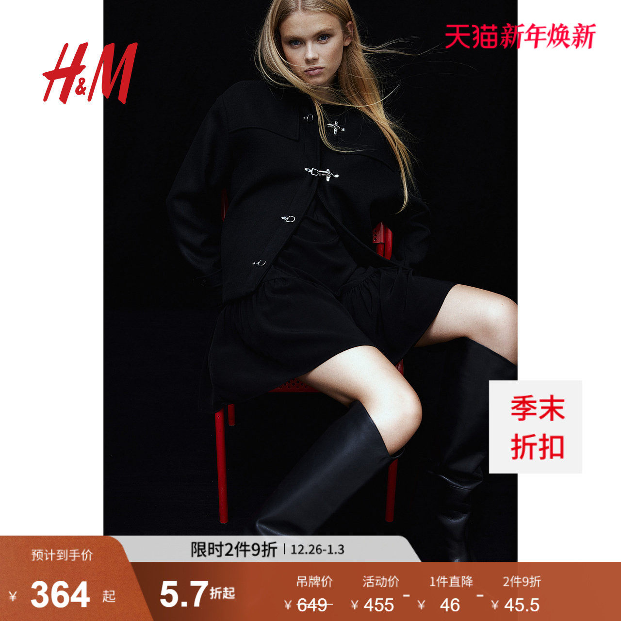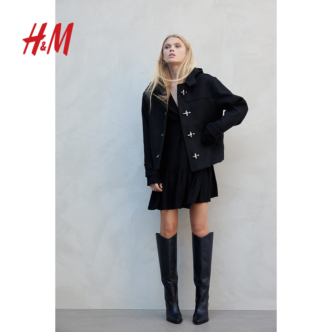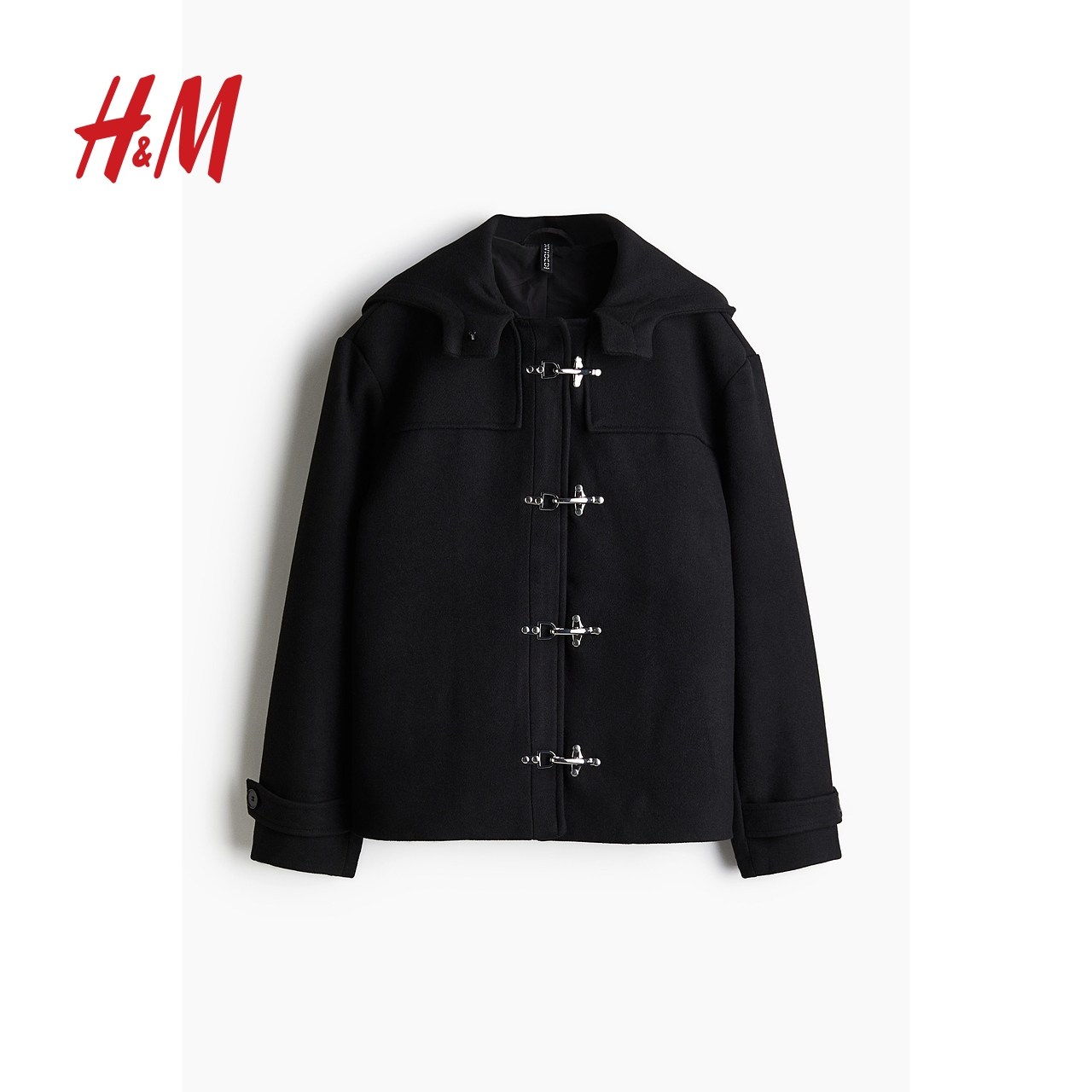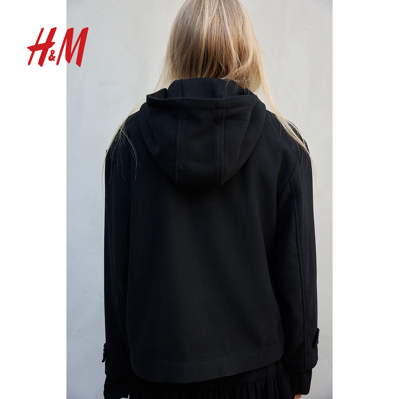 HM女装毛呢外套冬季宽松连帽梭织立领金属扣外套1262372