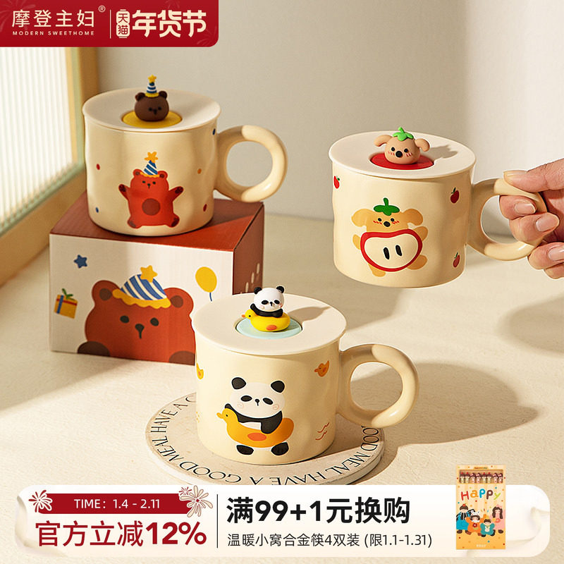 摩登主妇动物派对马克杯带盖陶瓷杯子办公室水杯早餐杯情侣咖啡杯