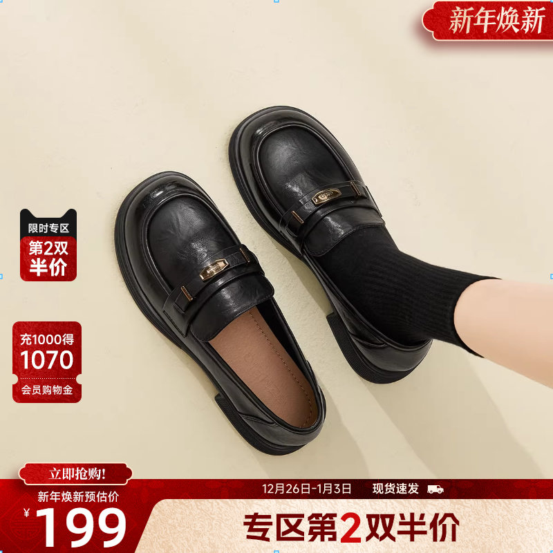 董洁同款真美诗自由之歌柔软水洗牛皮小皮鞋粗跟乐福鞋女男女同款