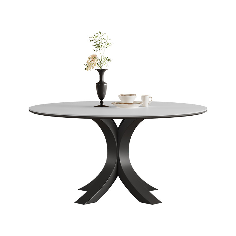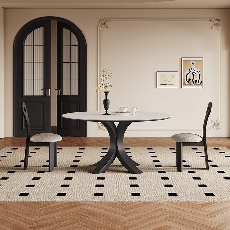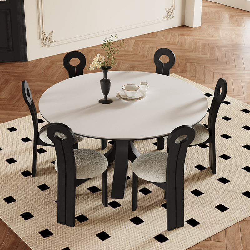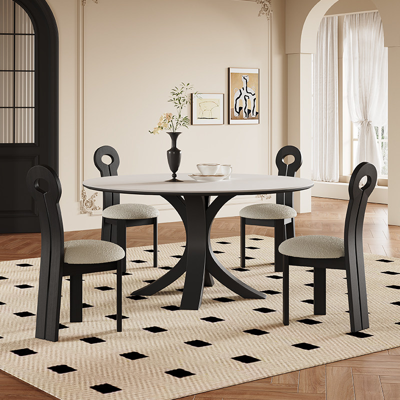 法式岩板餐桌现代简约小户型轻奢高端黑色复古6人圆形餐桌带转盘