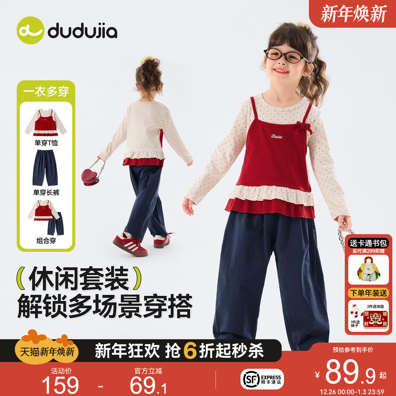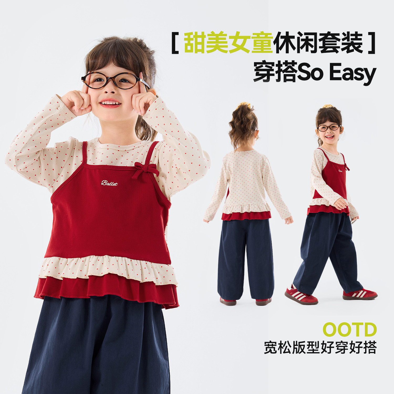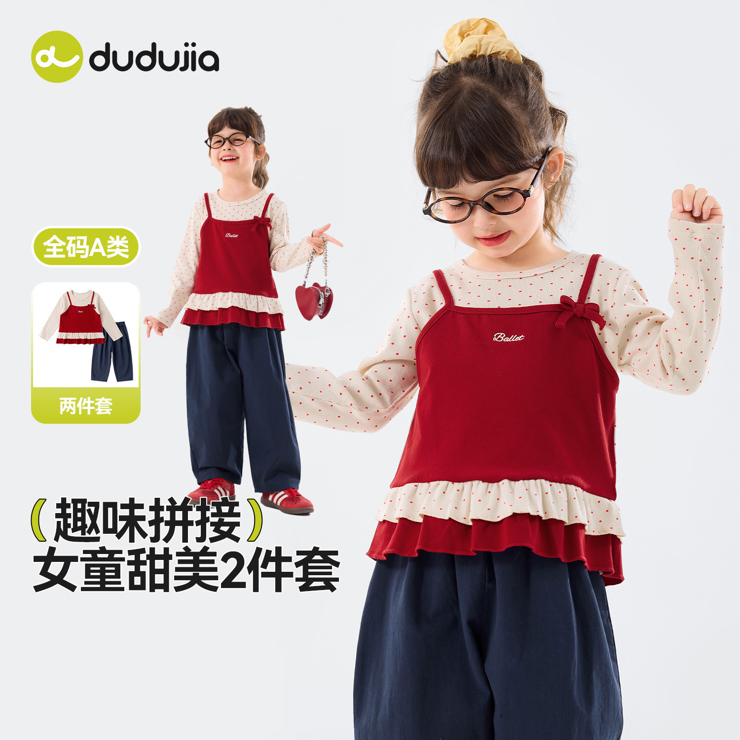 嘟嘟家女童套装春秋款宝宝上衣假两件T恤波点衣服荷叶边儿童童装
