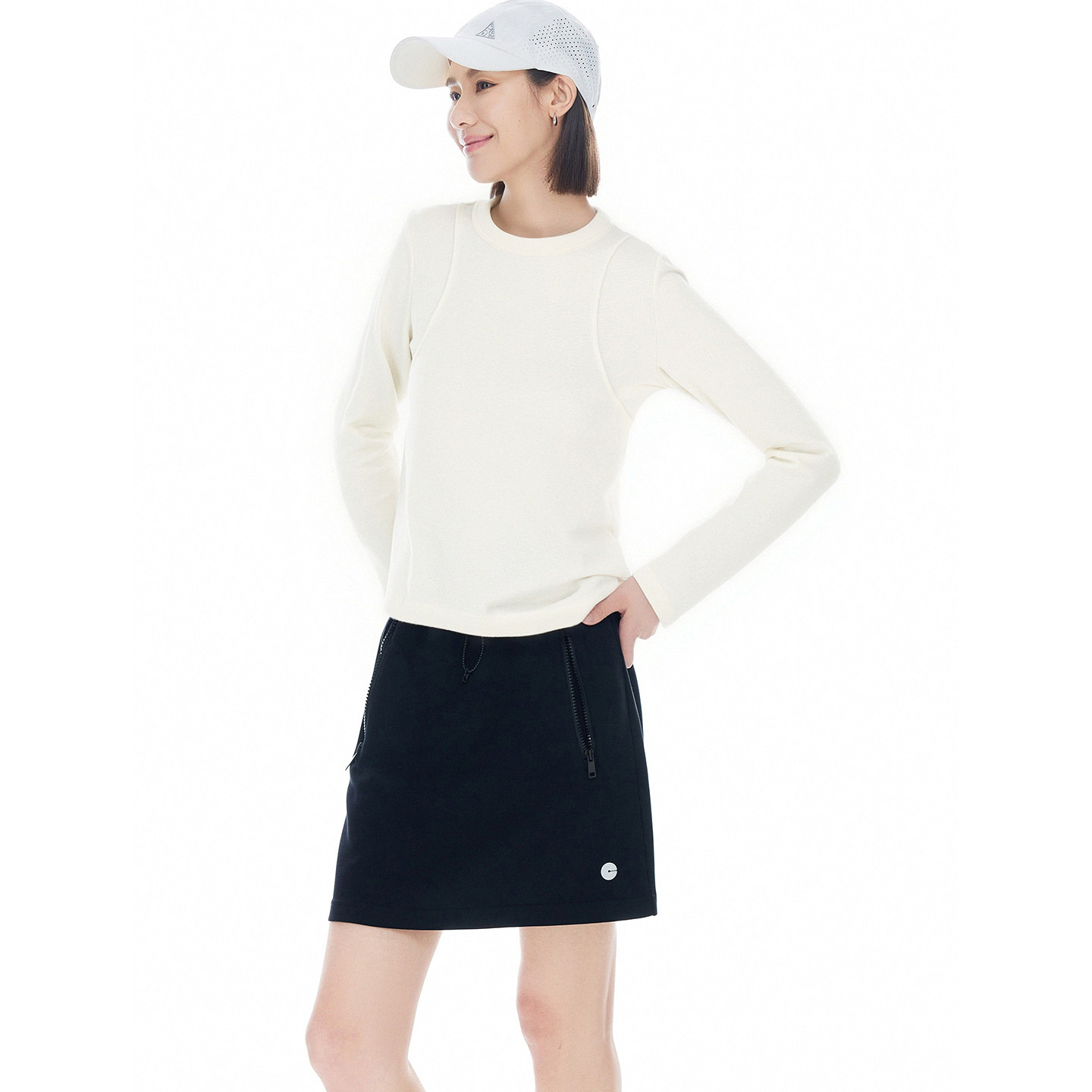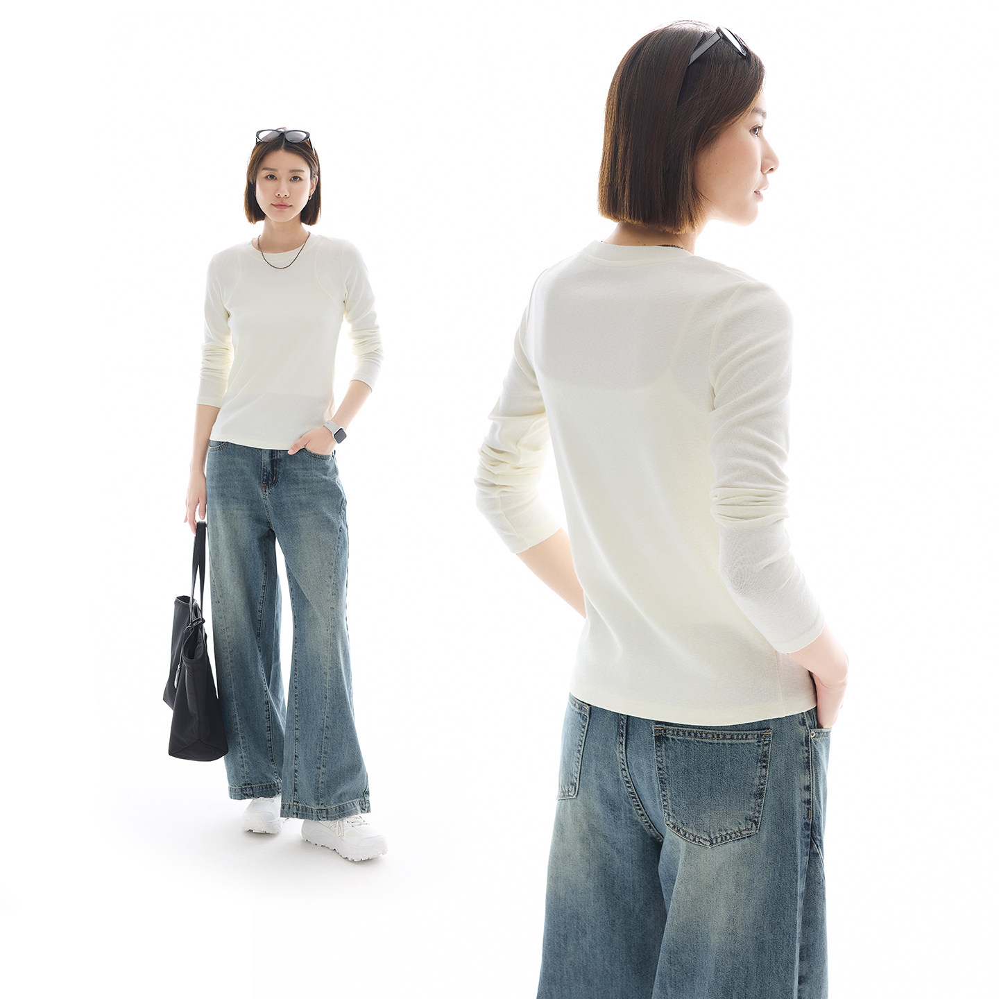 蕉下亨利衫女长袖T恤v领秋冬修身保暖低领打底衫半开领白色上衣