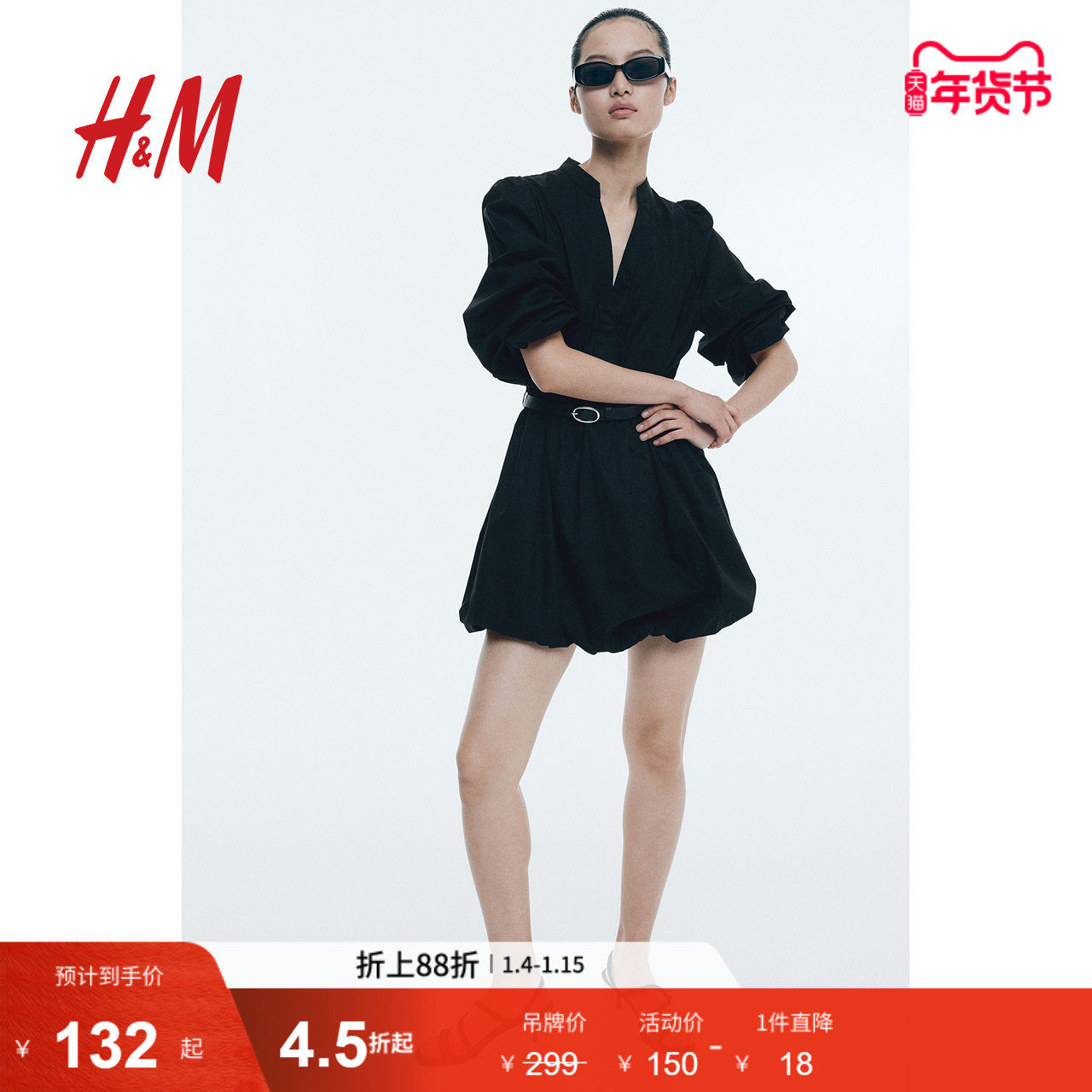 HM女装连衣裙冬季束腰配腰带灯笼袖泡泡下摆A字裙1272211