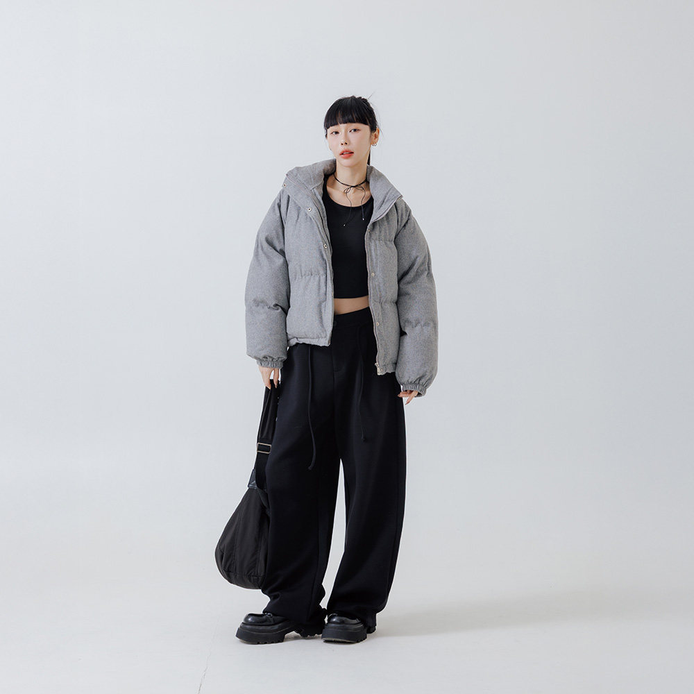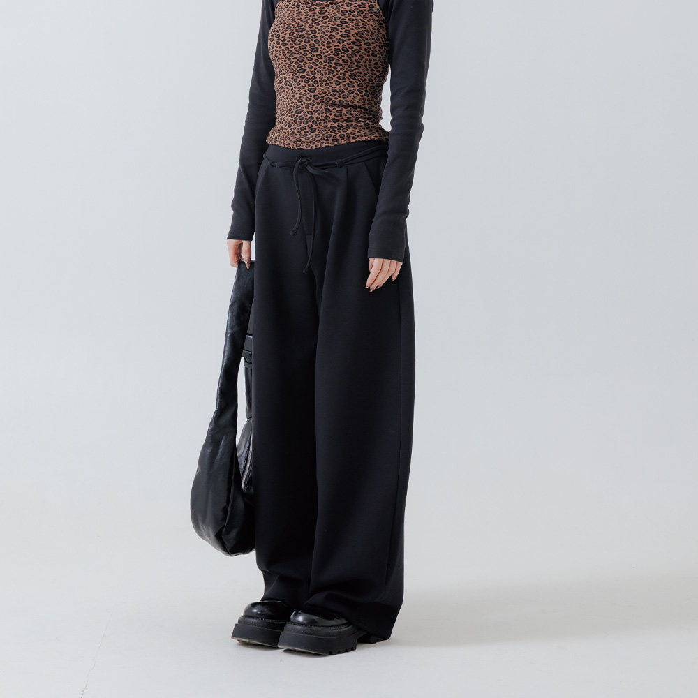 QUEENSHOP 2025秋冬新品女装空气棉质绑绳宽版长裤-黑04020581