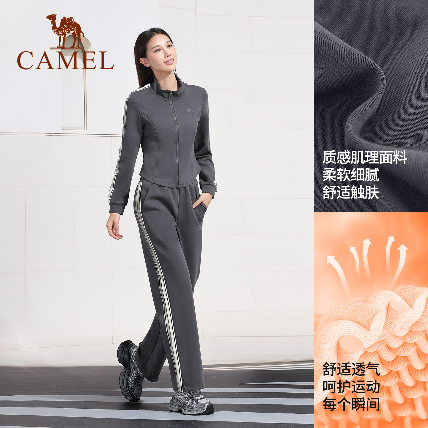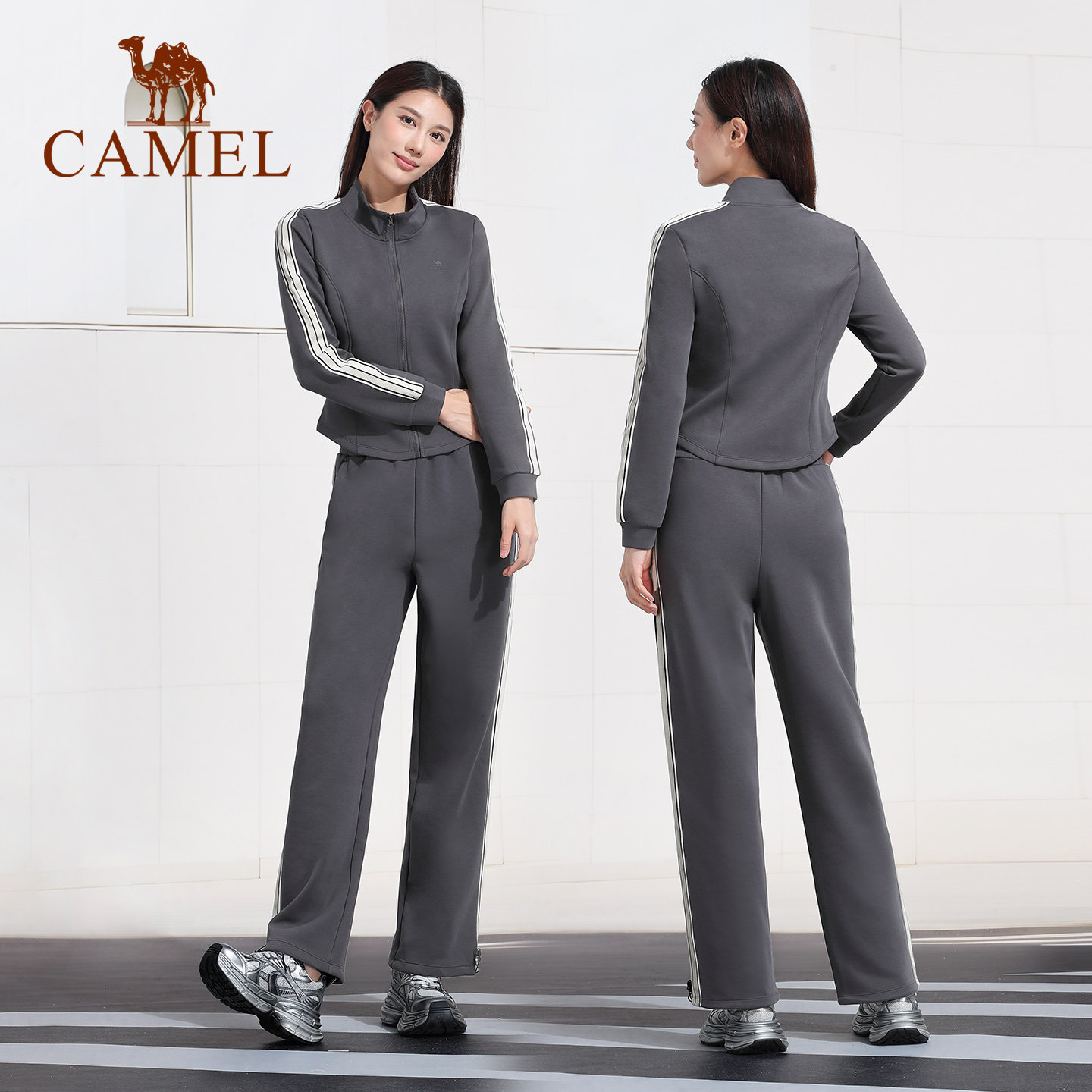 骆驼休闲套装女款秋冬防风保暖立领修身健身服时尚运动长袖两件套
