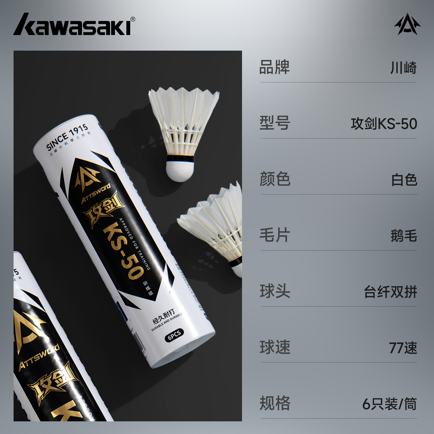 川崎KAWASAKI羽毛球比赛训练飞行稳定耐打鹅毛球6个装77速KS-50