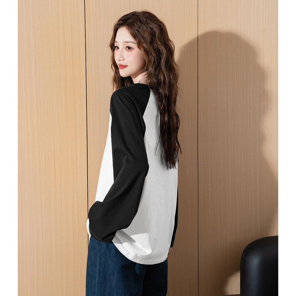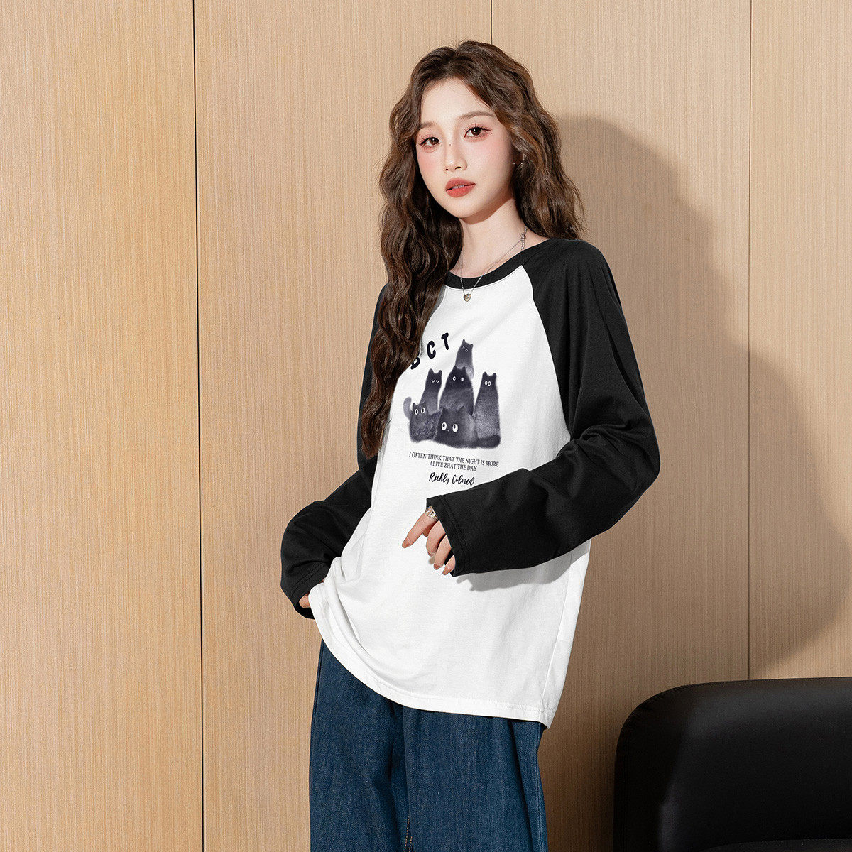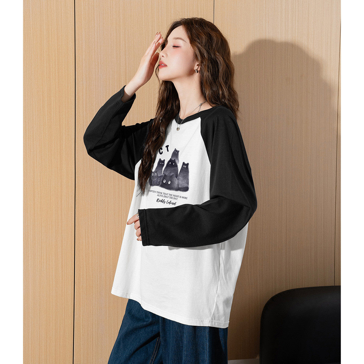 唐狮春秋季女长袖T恤插肩袖撞色拼接猫咪可爱风甜美时尚气质TE