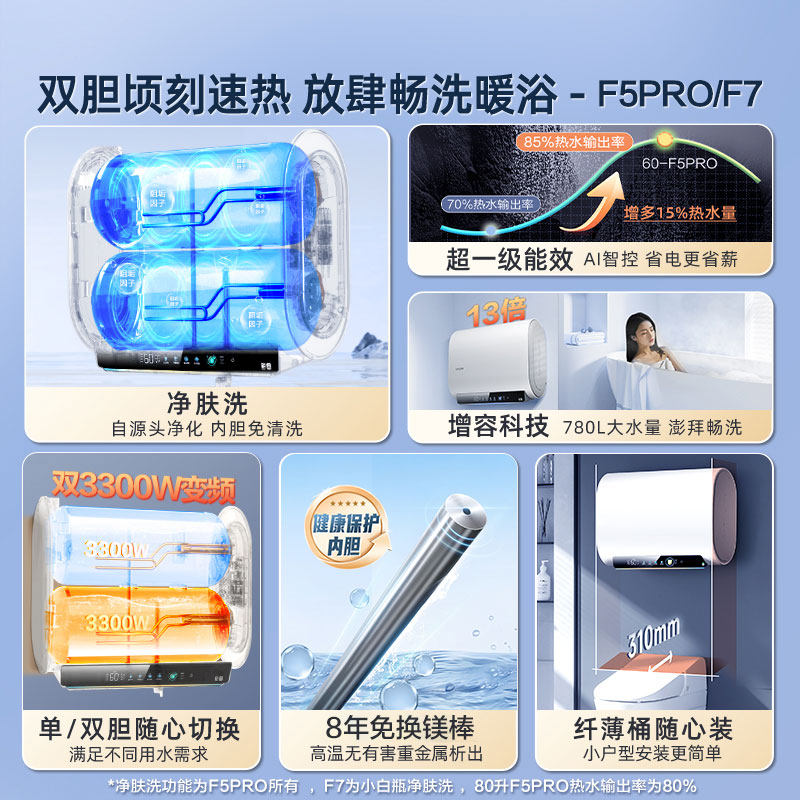 【国家补贴】海尔出品统帅电热水器家用一级能效扁桶节能F5PRO
