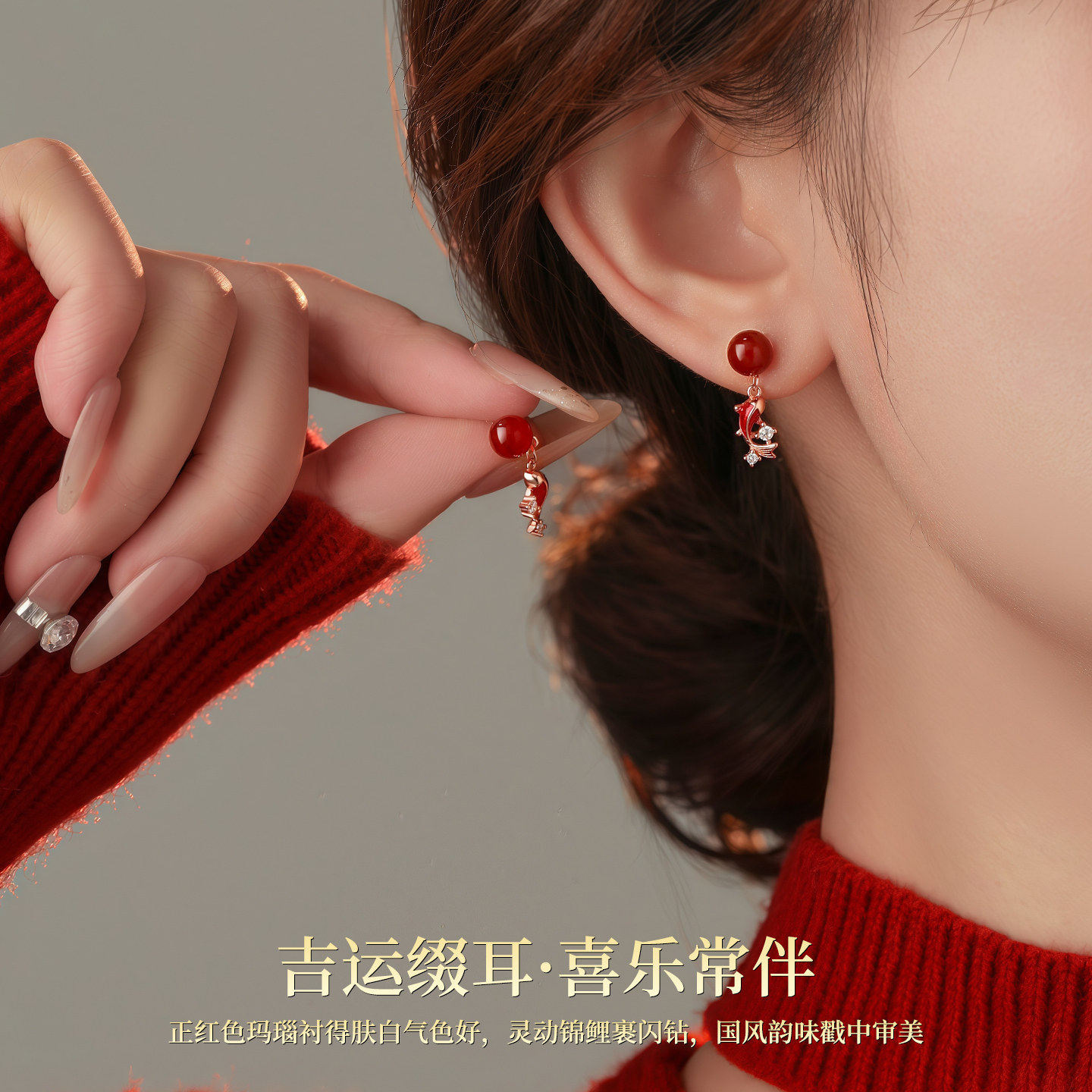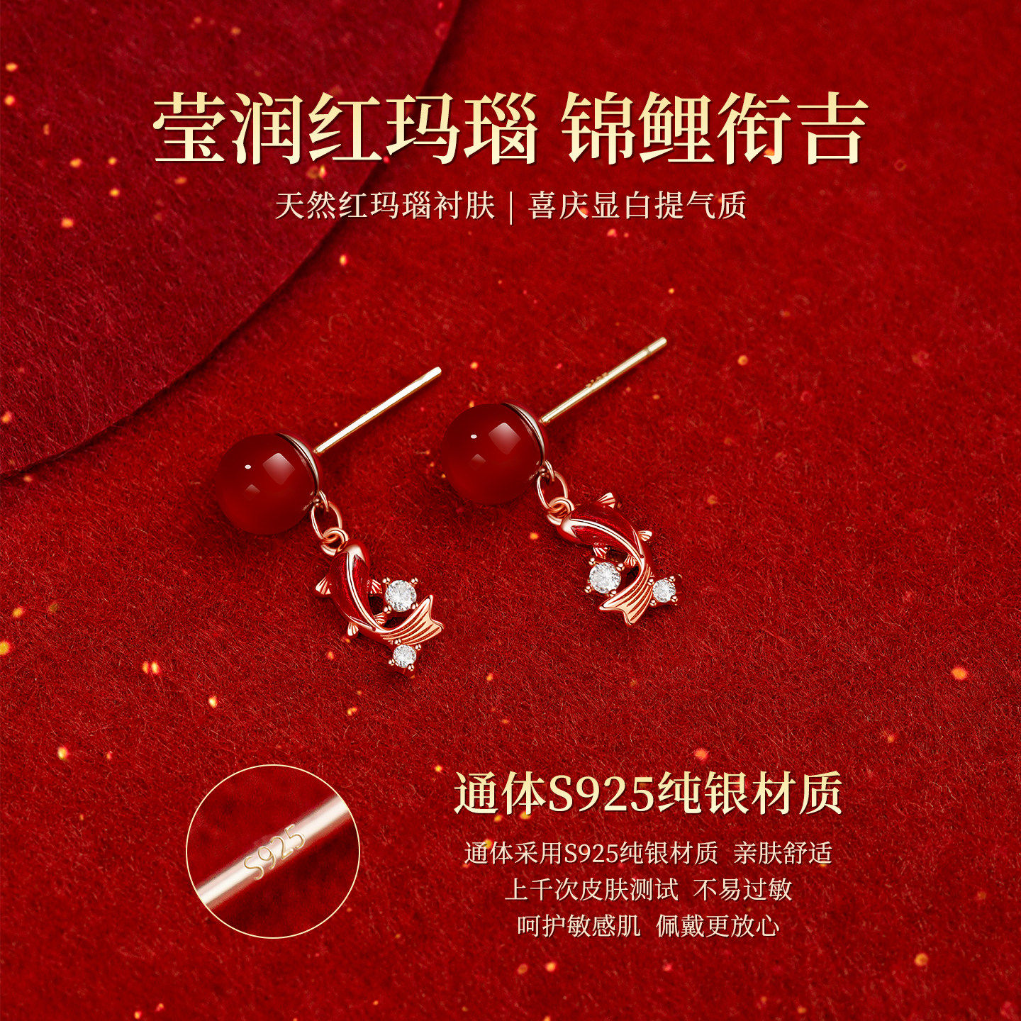 S925纯银锦鲤耳钉红玛瑙本命年秋冬红色耳环2026新款爆款耳饰气质