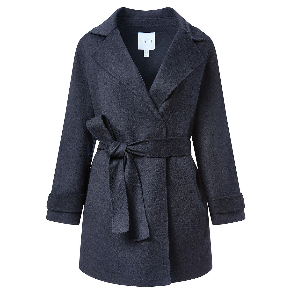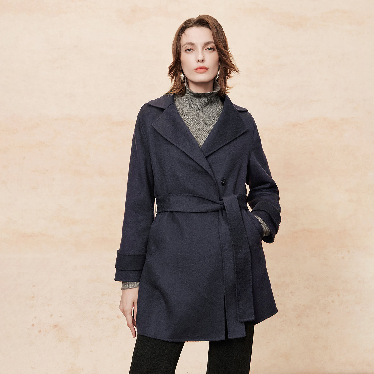 菲妮迪毛呢外套2025冬季新款简约系带西装领双面呢气质长款大衣女