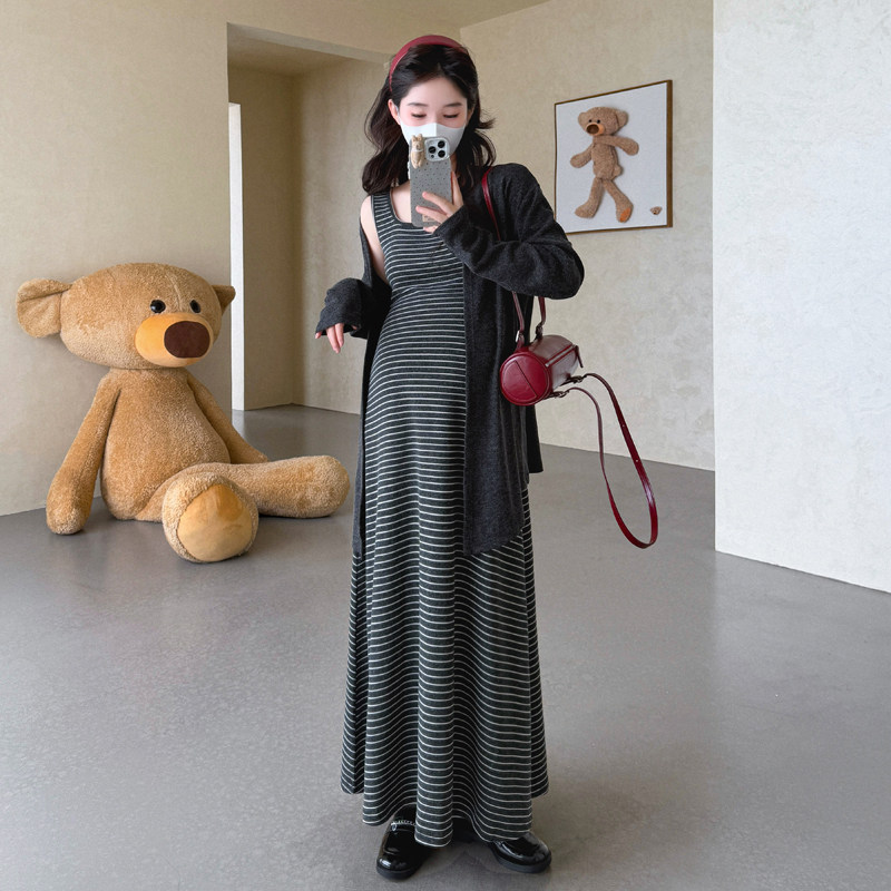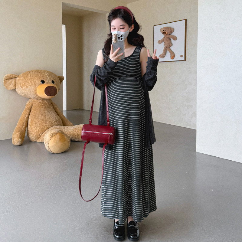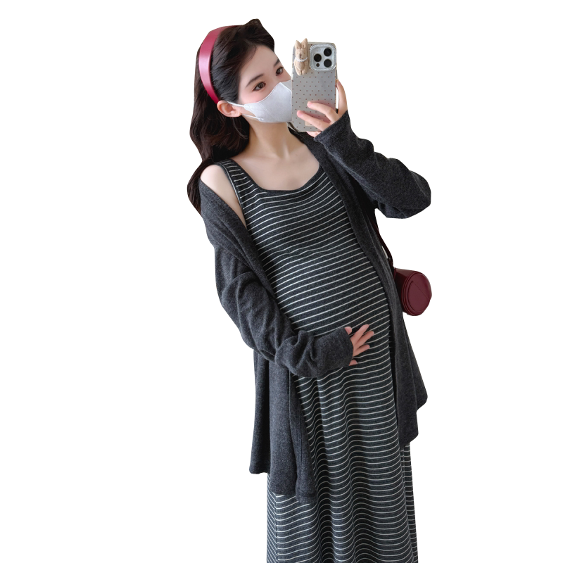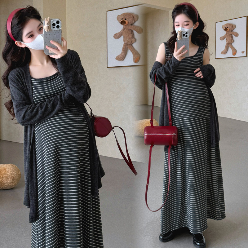婧麒孕妇连衣裙春秋高级感2026新款条纹长袖吊带裙宽松套装两件套
