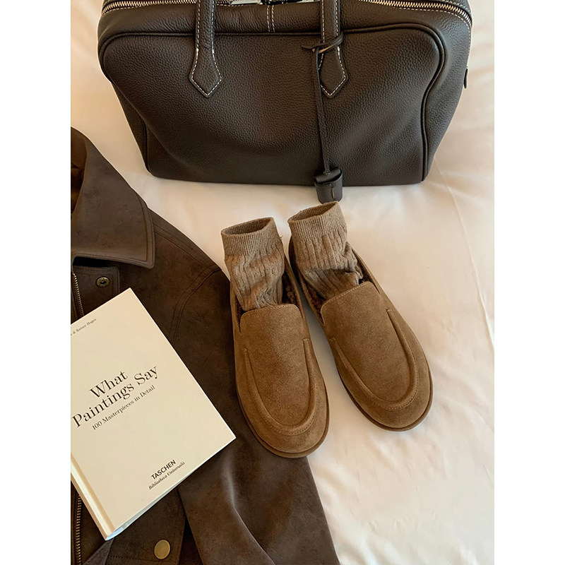 牛皮版~真皮乐福鞋女秋冬一脚蹬加绒毛毛豆豆鞋灰色毛绒平底圆头