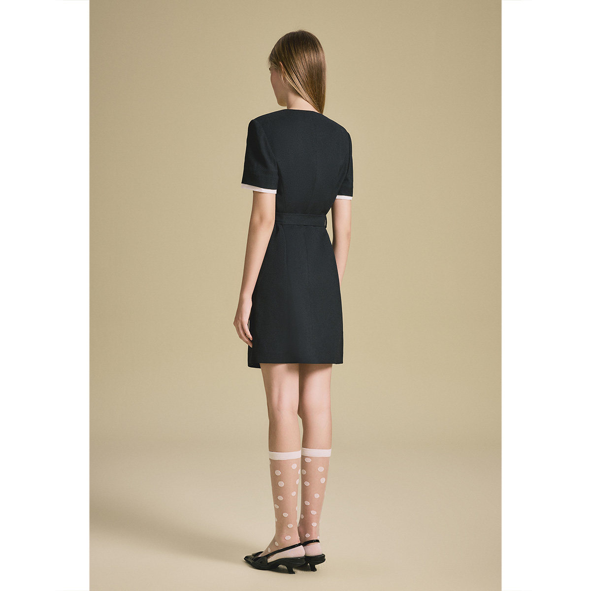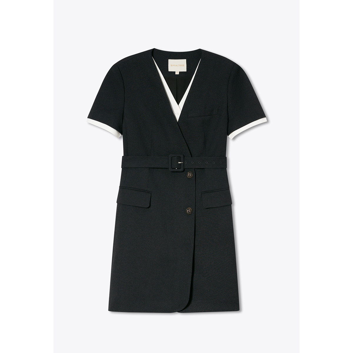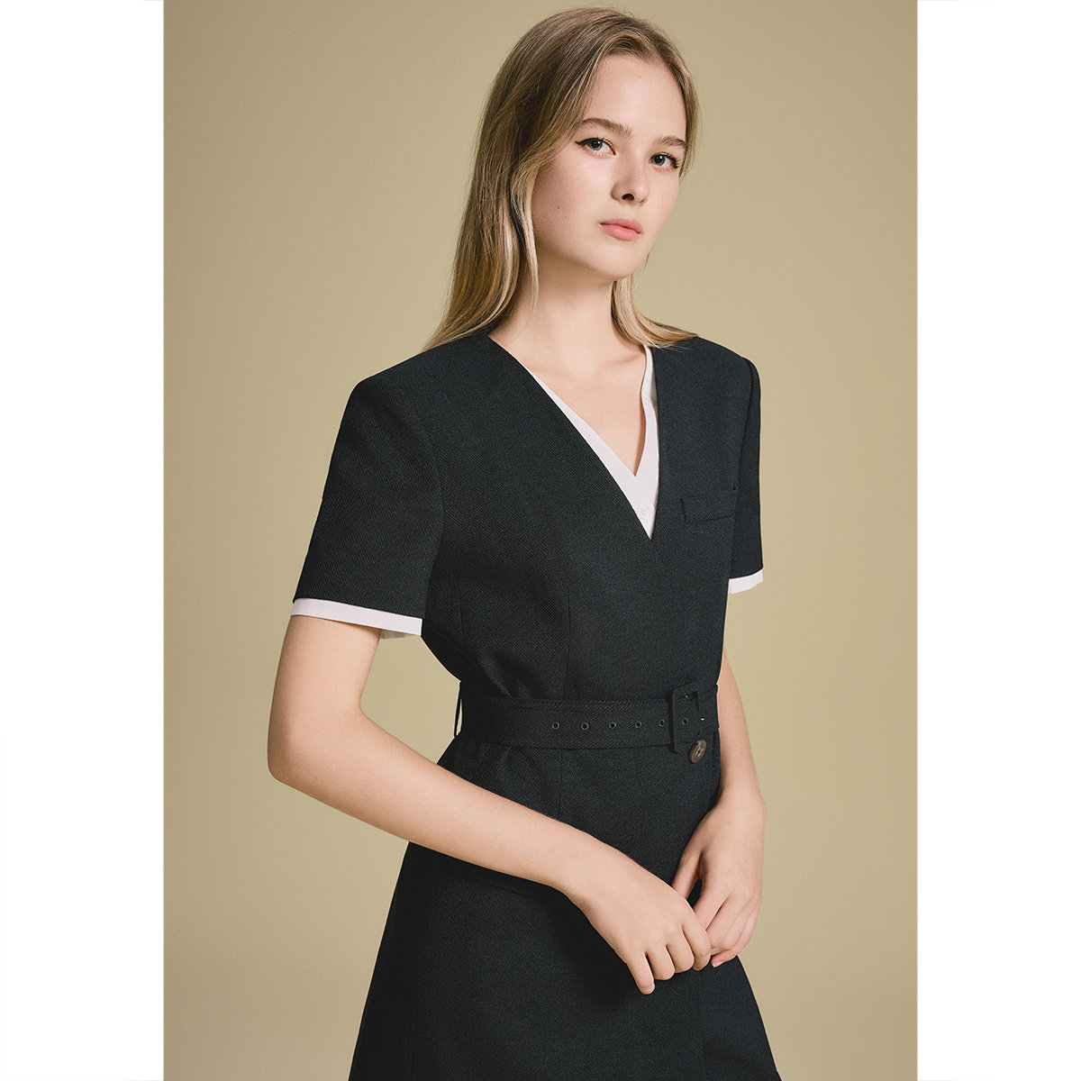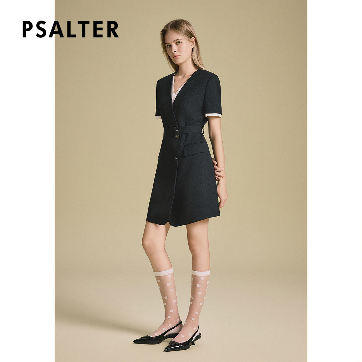 诗篇专选假两件撞色斜纹肌理收腰修身系带西装连衣裙2025夏款