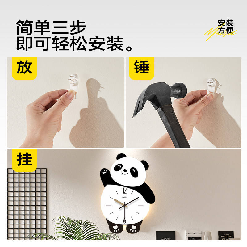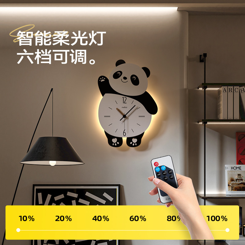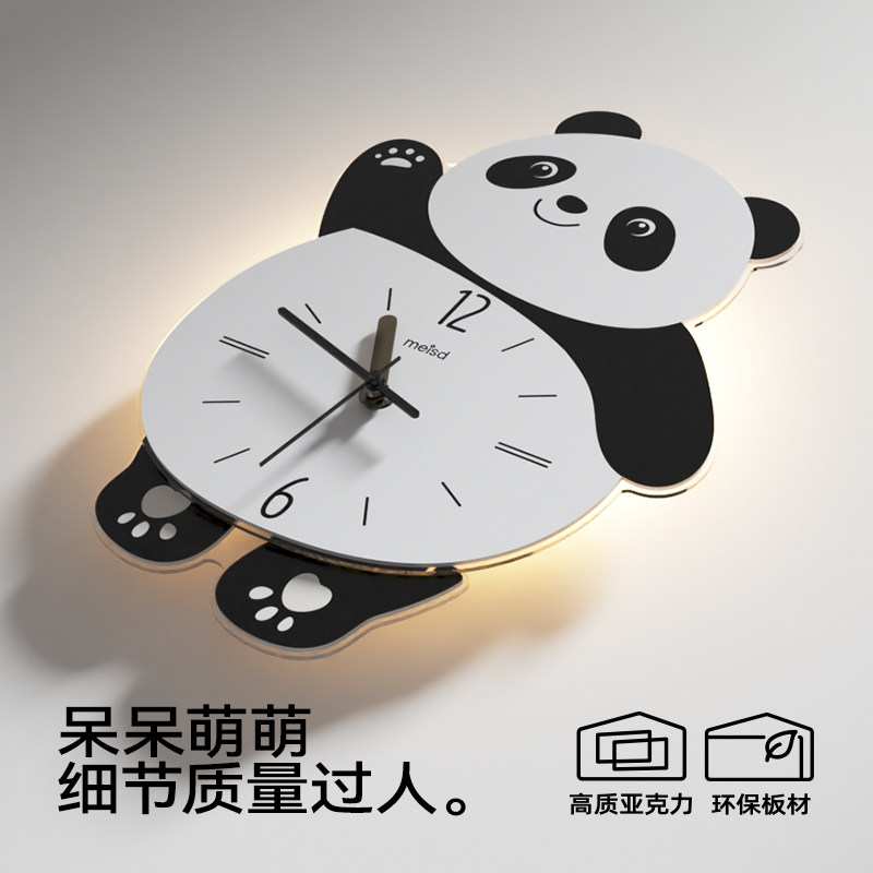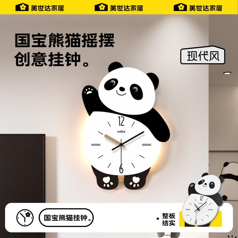 美世达熊猫客厅挂钟2026新款免打孔创意时钟壁灯静音儿童钟表餐厅