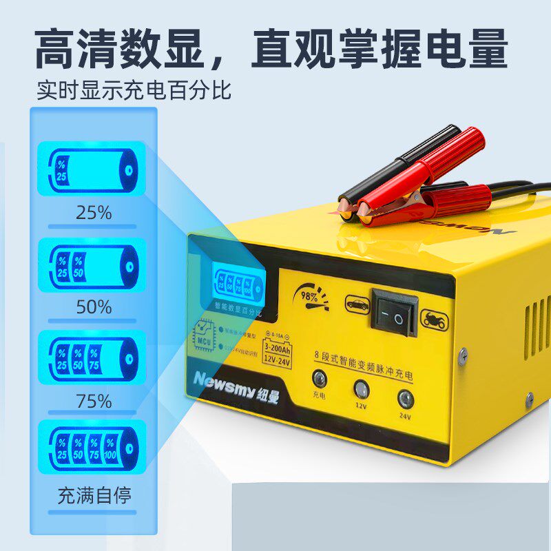 纽曼汽车电瓶充电器12v摩托车蓄电池充电智能大功率修复型充电机