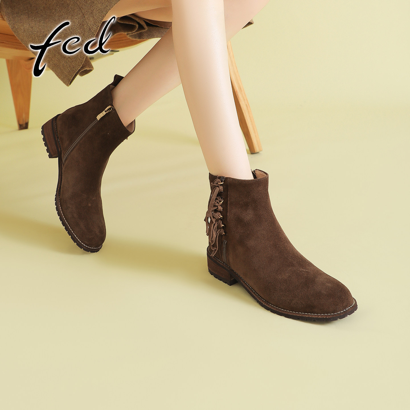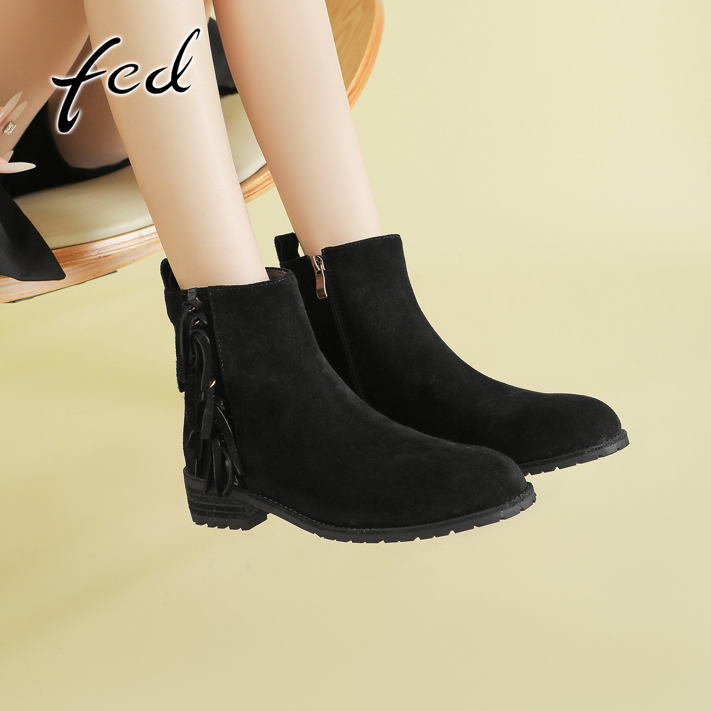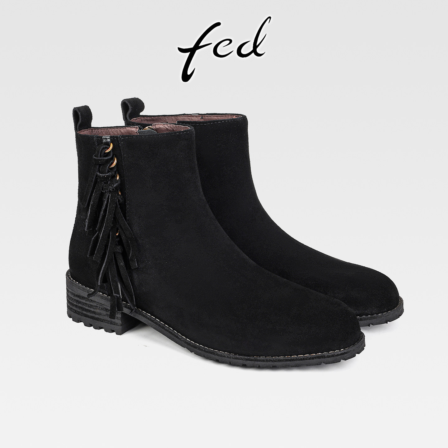 fed复古牛反绒粗跟流苏瘦瘦靴女秋冬新款百搭侧拉链中跟圆头短靴