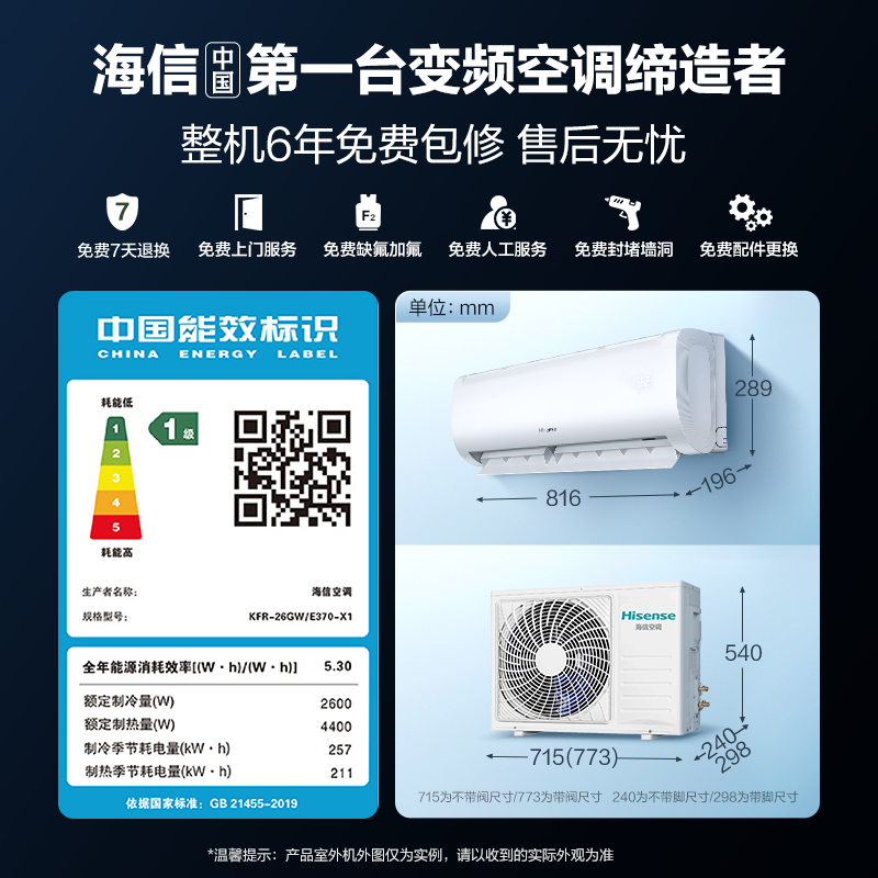 海信大1匹易省电E370空调家用挂机式一级能效变频卧室壁挂式
