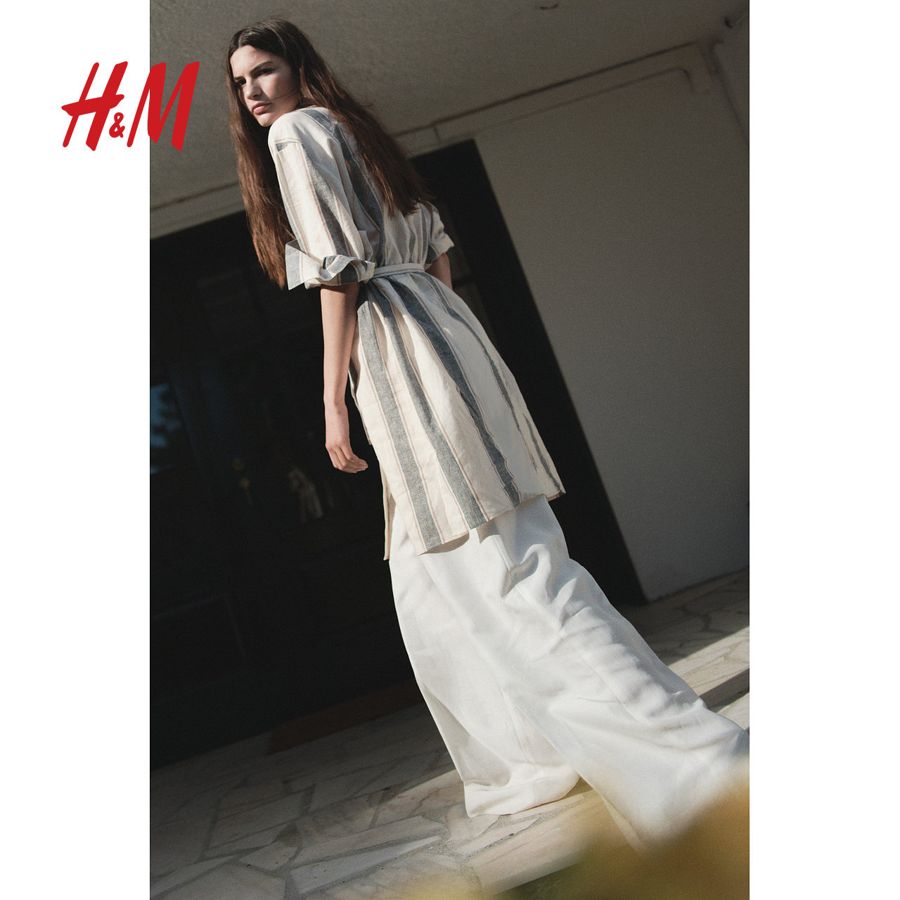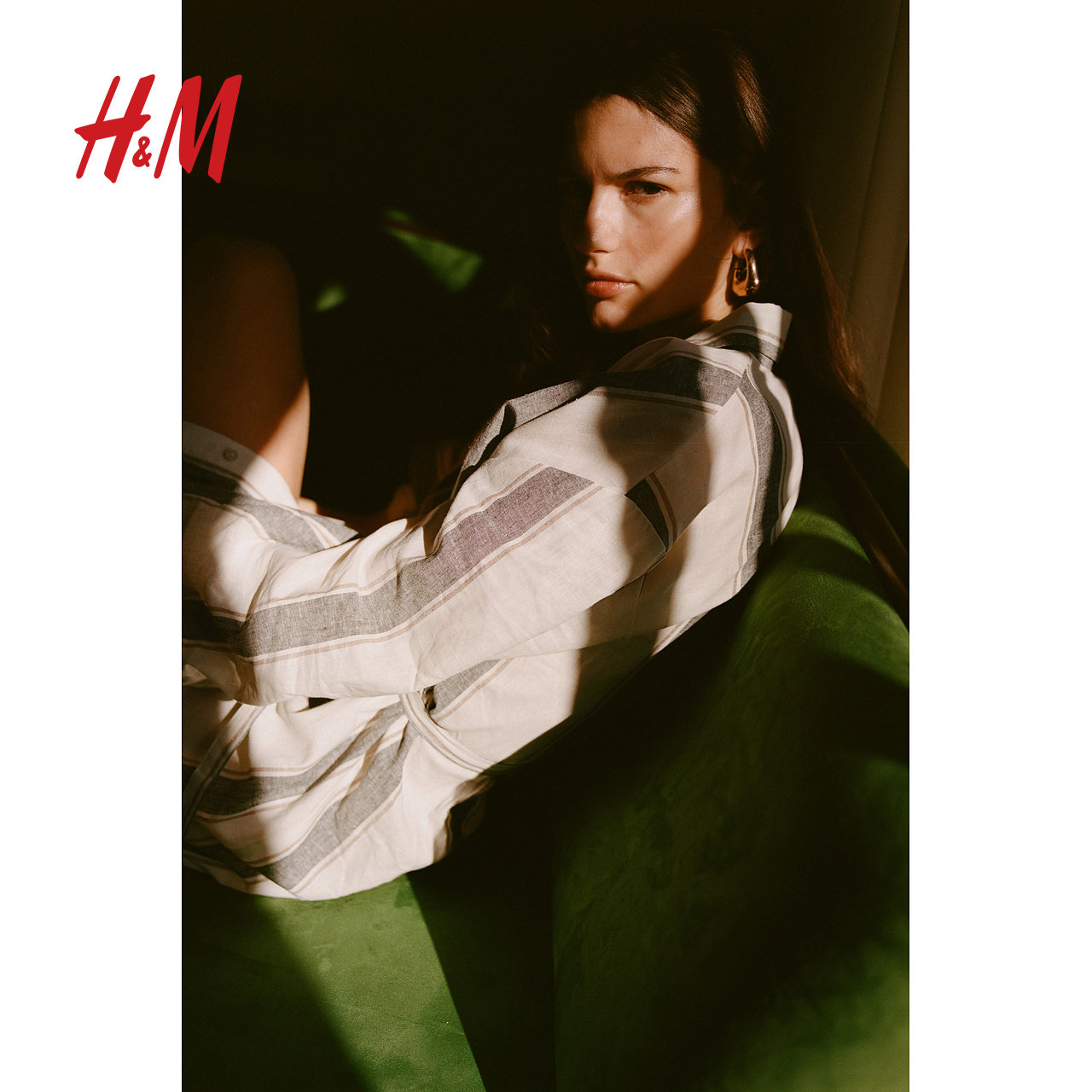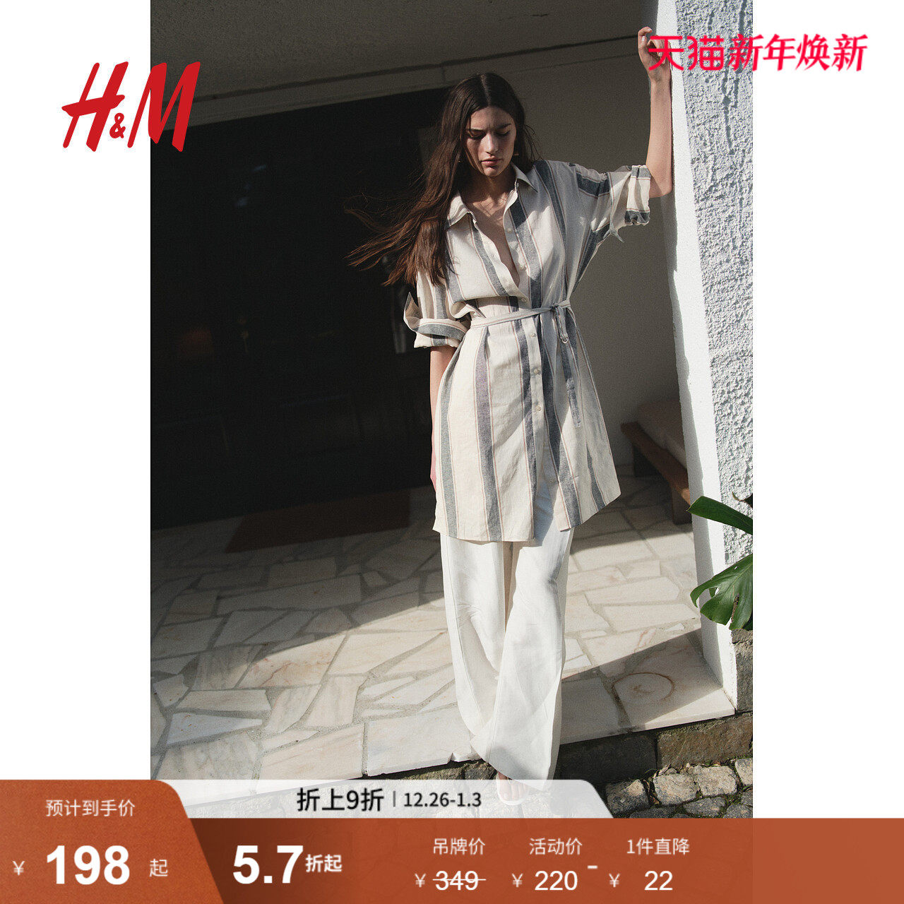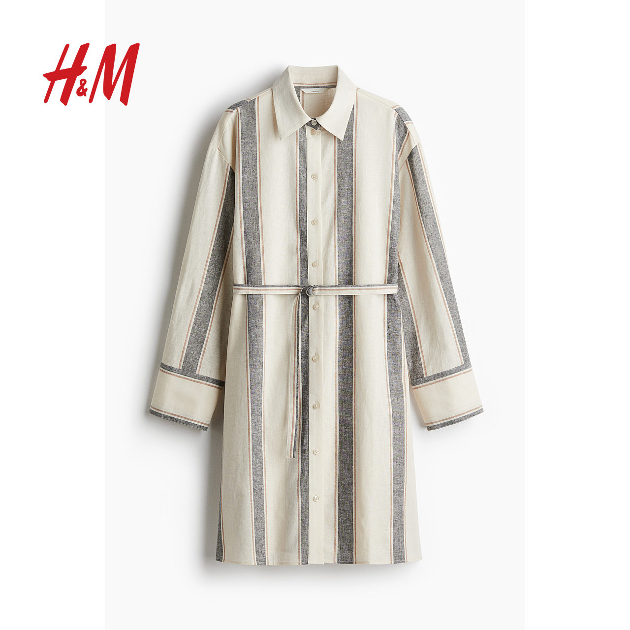 HM女装连衣裙25冬新款透气亚麻混纺时尚及膝衬衫式连衣裙1275768