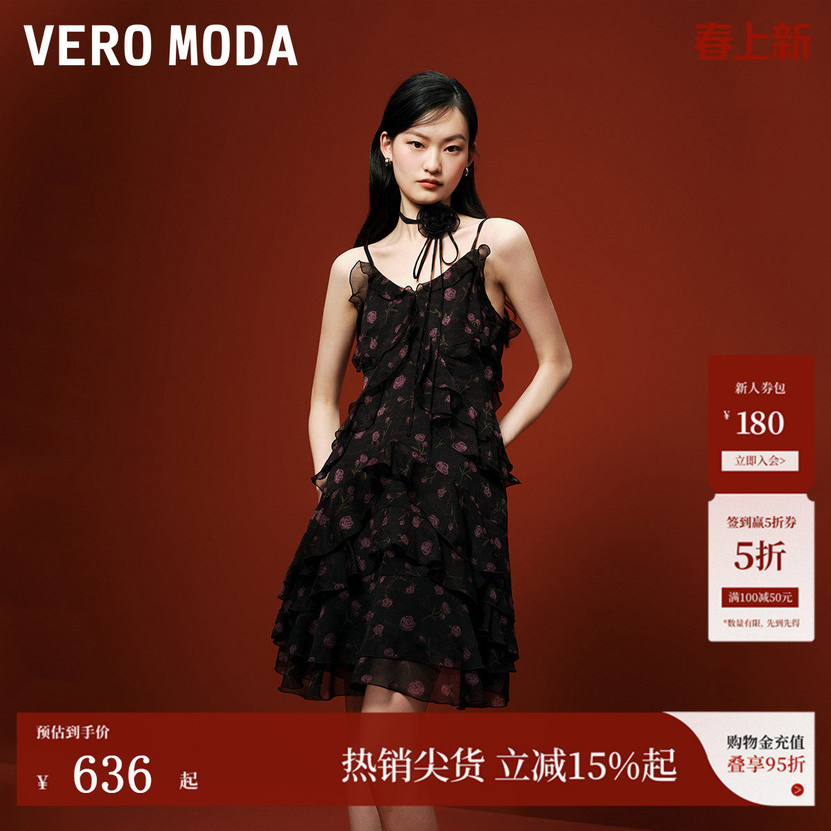 Vero Moda连衣裙秋冬千金风甜美荷叶边系带碎花吊带裙32427A040