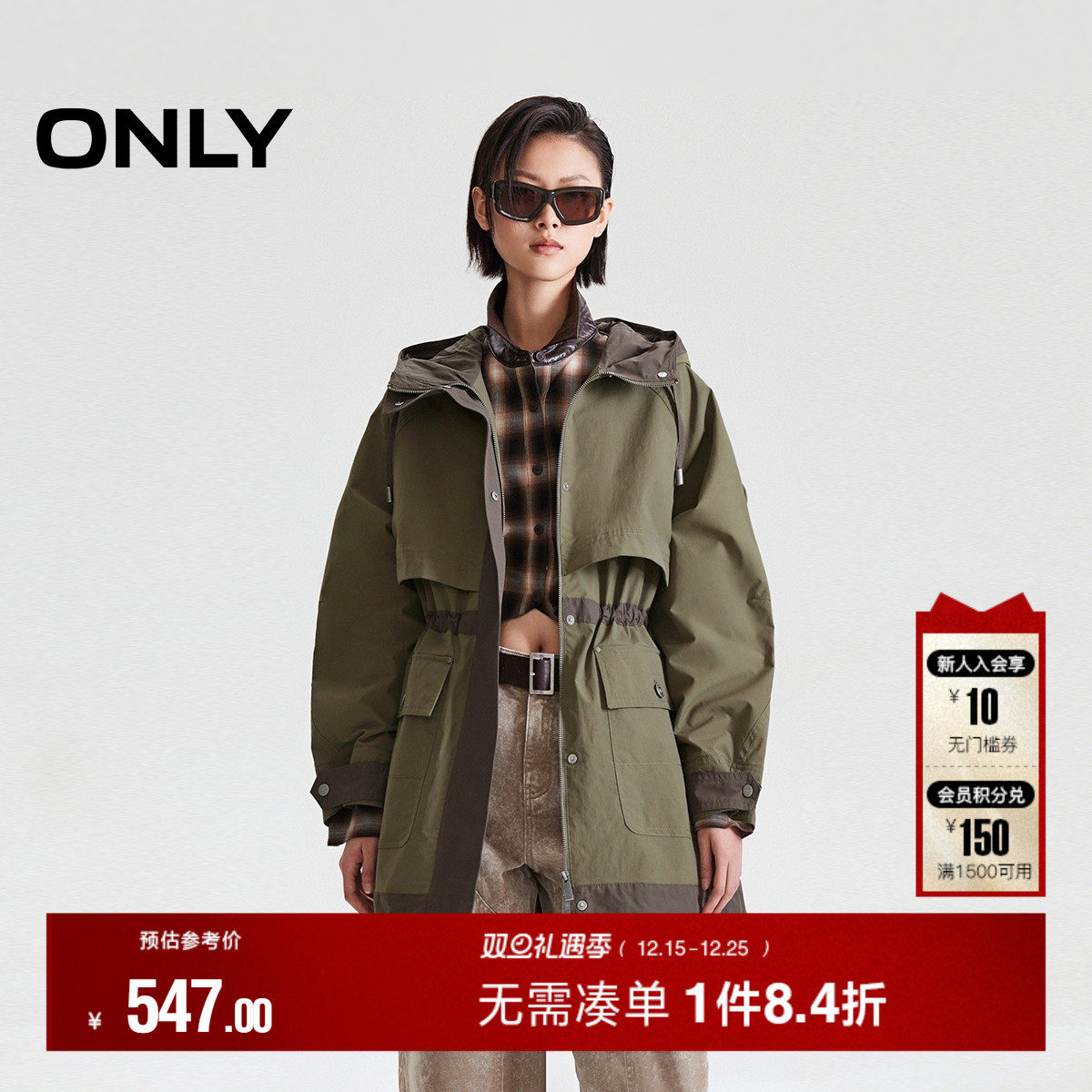 ONLY2025秋季新款双开拉链收腰工装风保暖连帽宽松中长款外套女