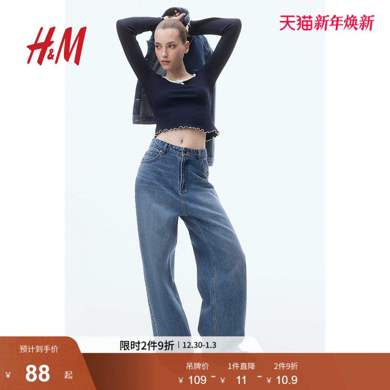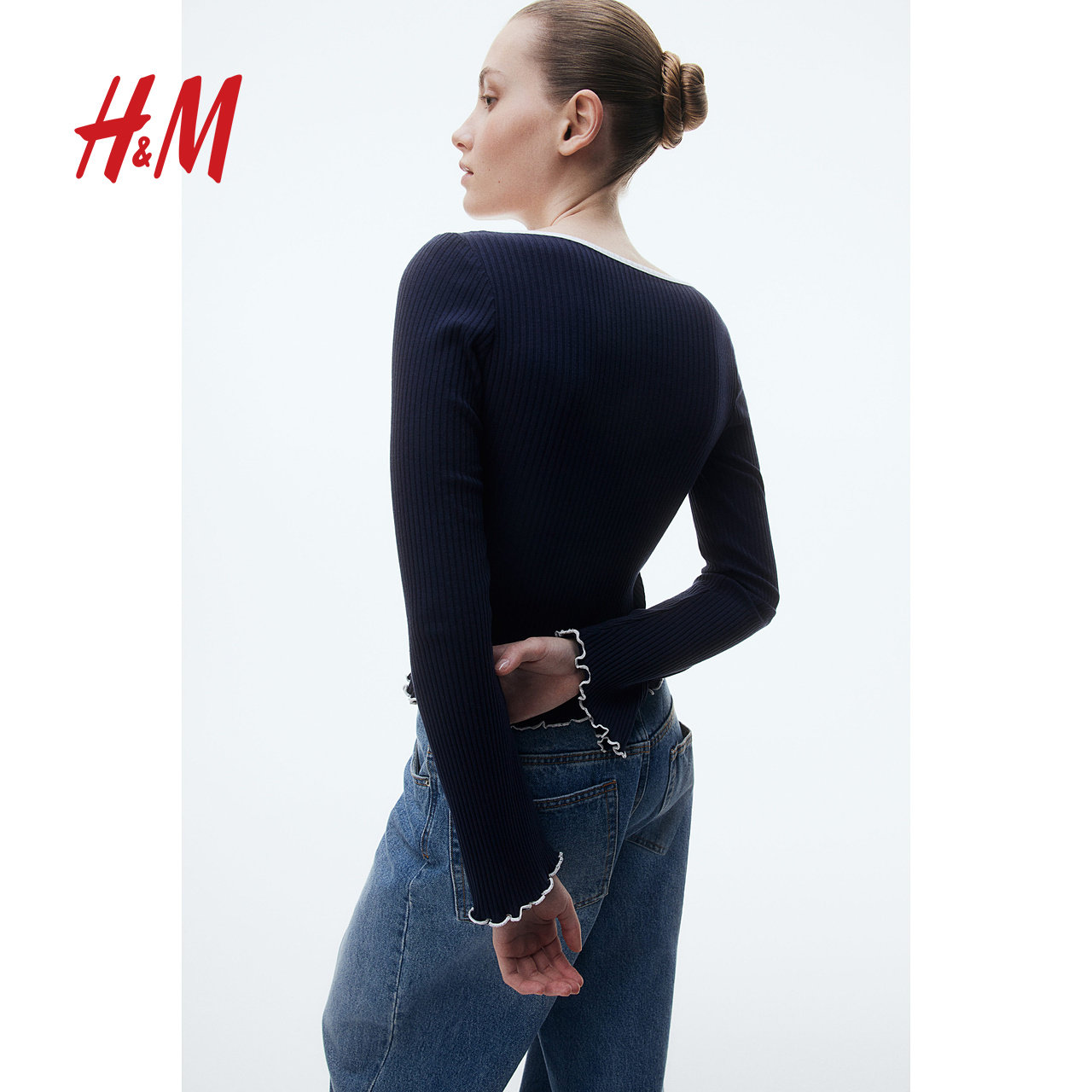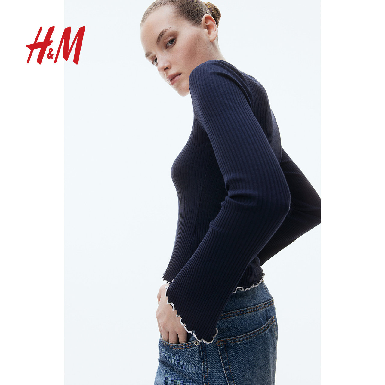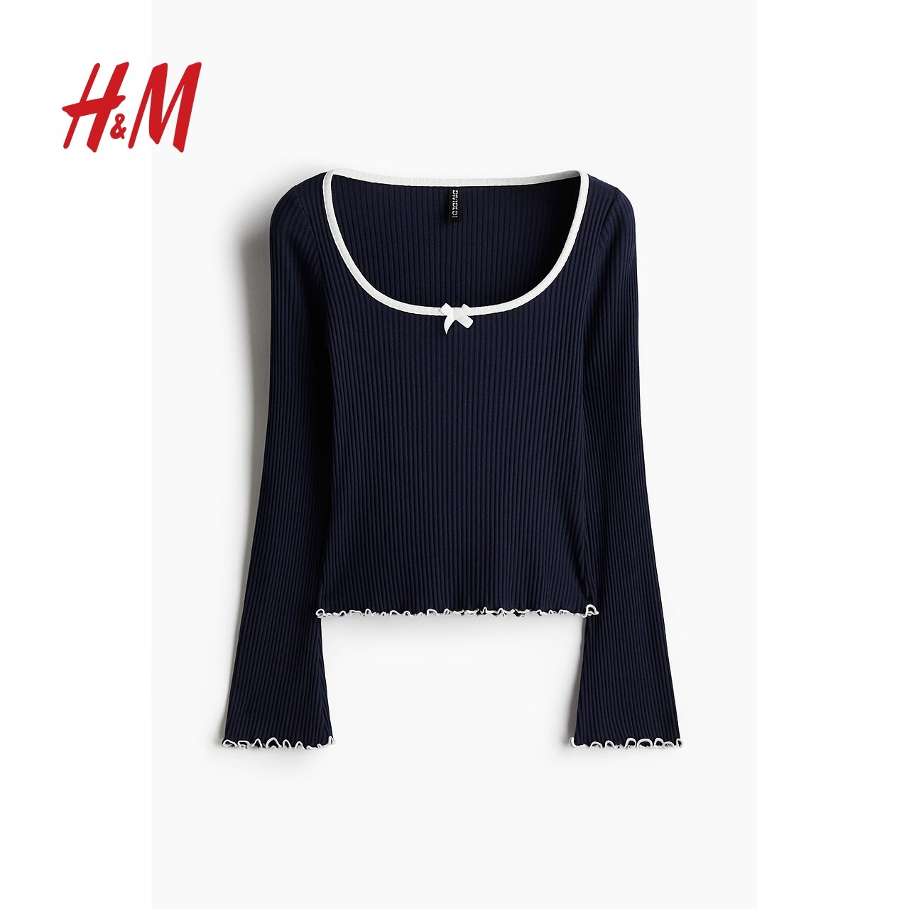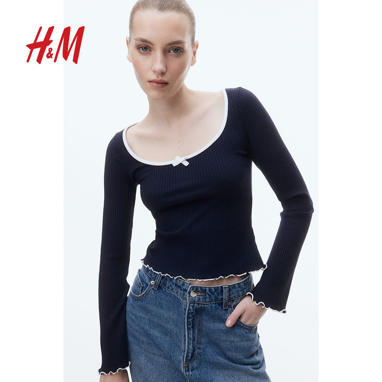 HM女装T恤冬季修身锁边罗纹低方领蝴蝶结短上衣1272455