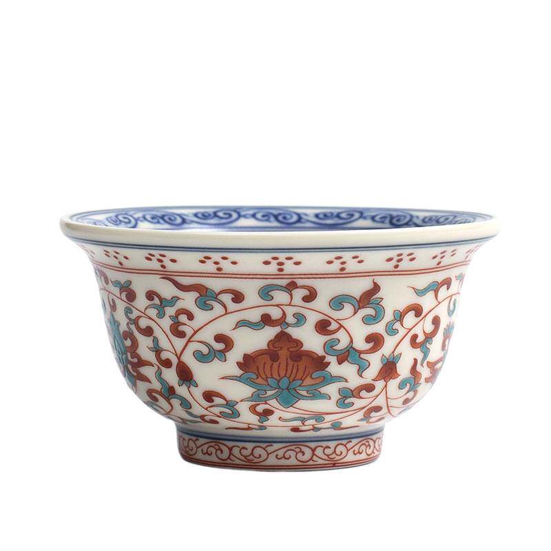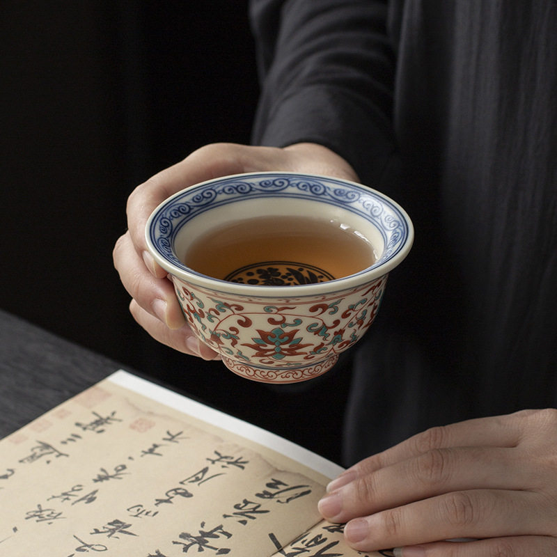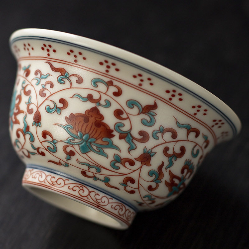 仿古红绿彩缠枝莲纹茶杯压手杯陶瓷功夫茶具泡茶杯家用个人专用杯