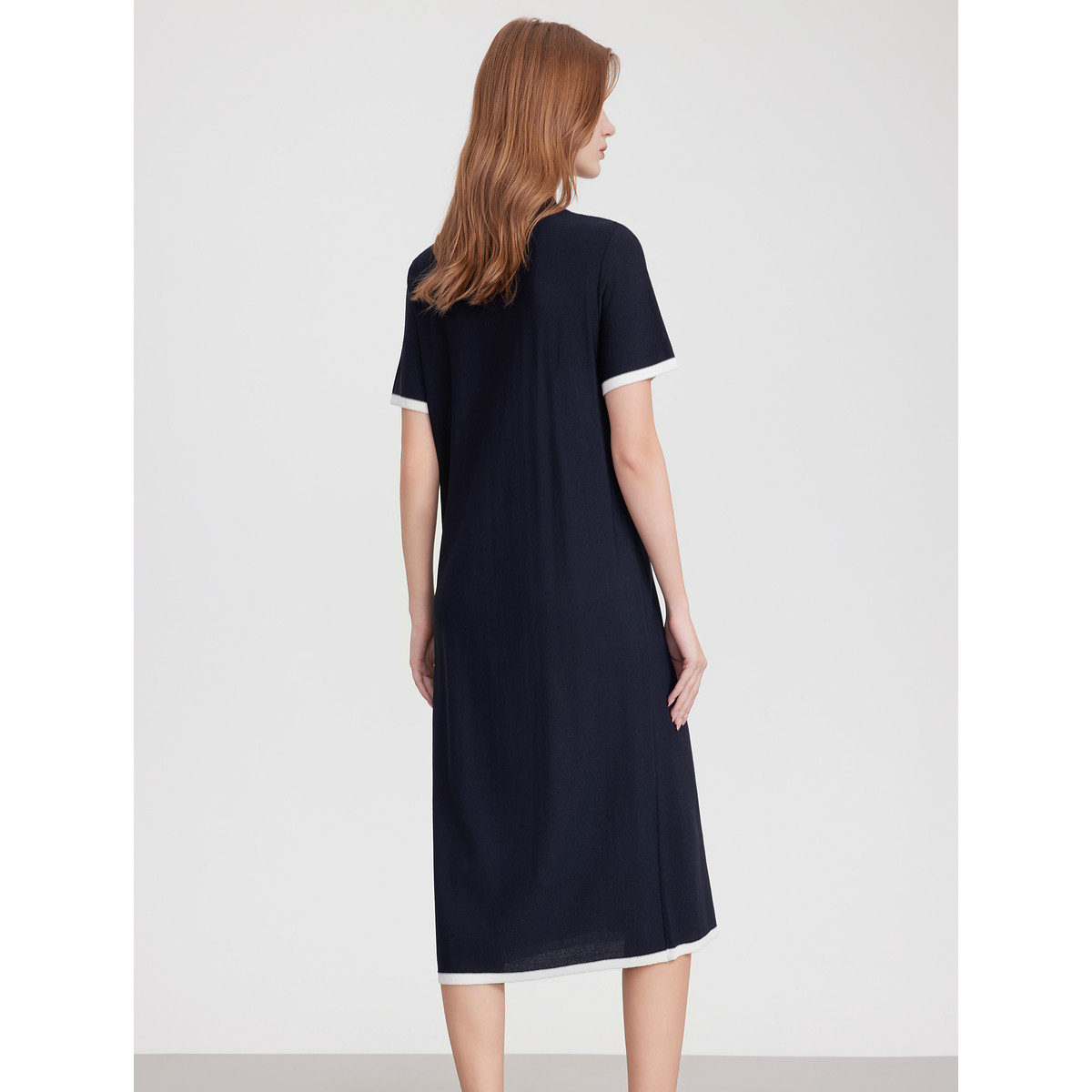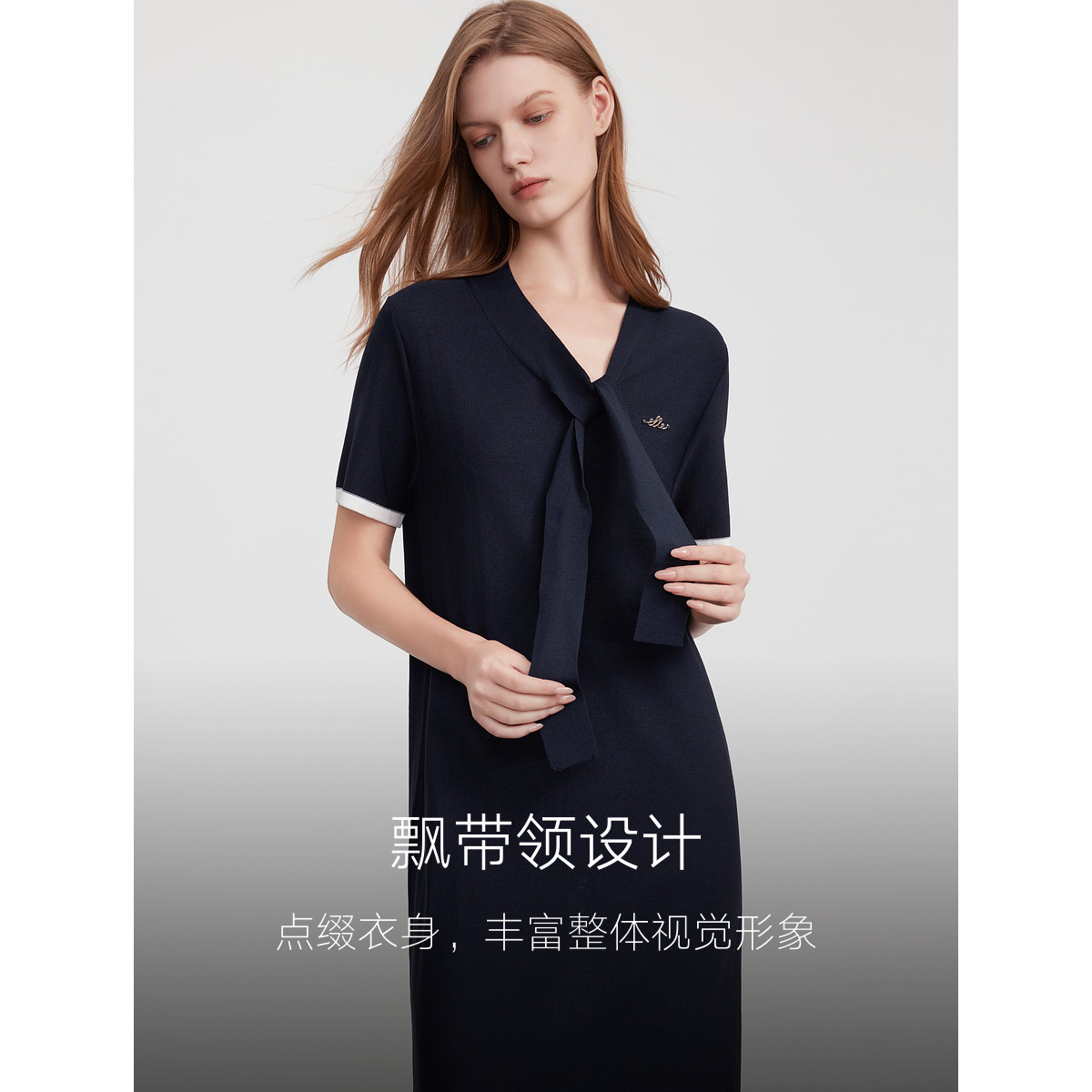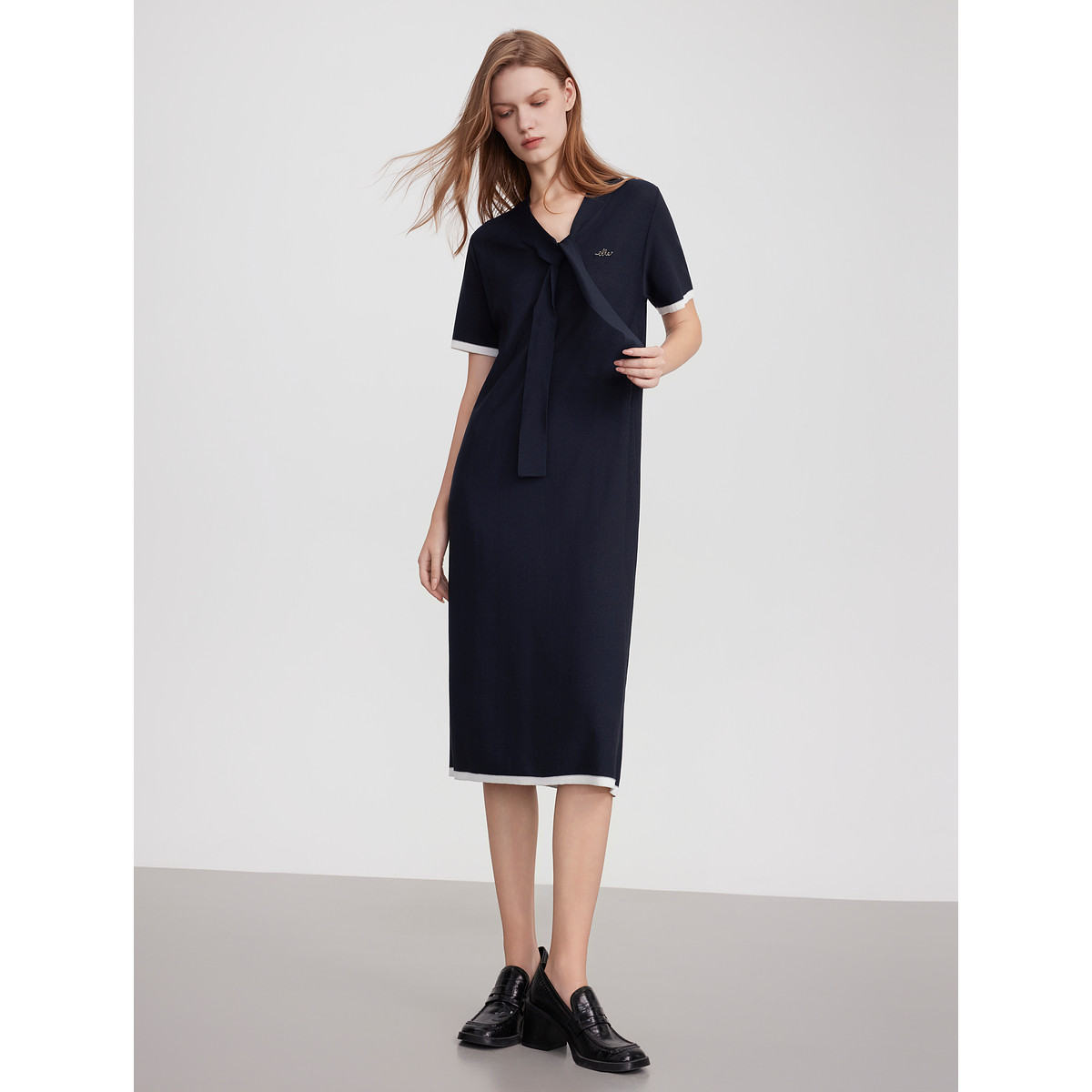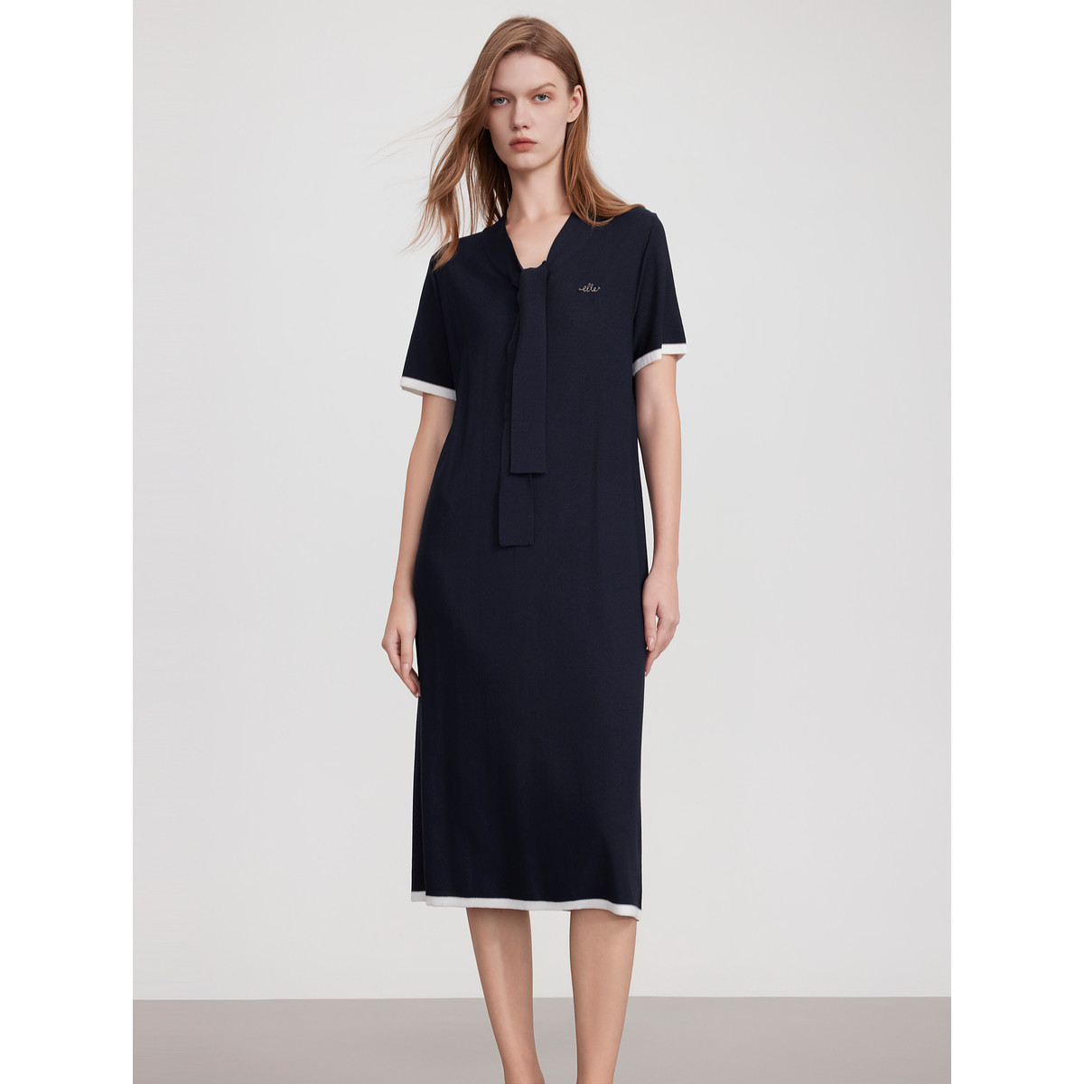 ELLE藏青色飘带领短袖连衣裙女2025秋季新款设计感气质显瘦T恤裙