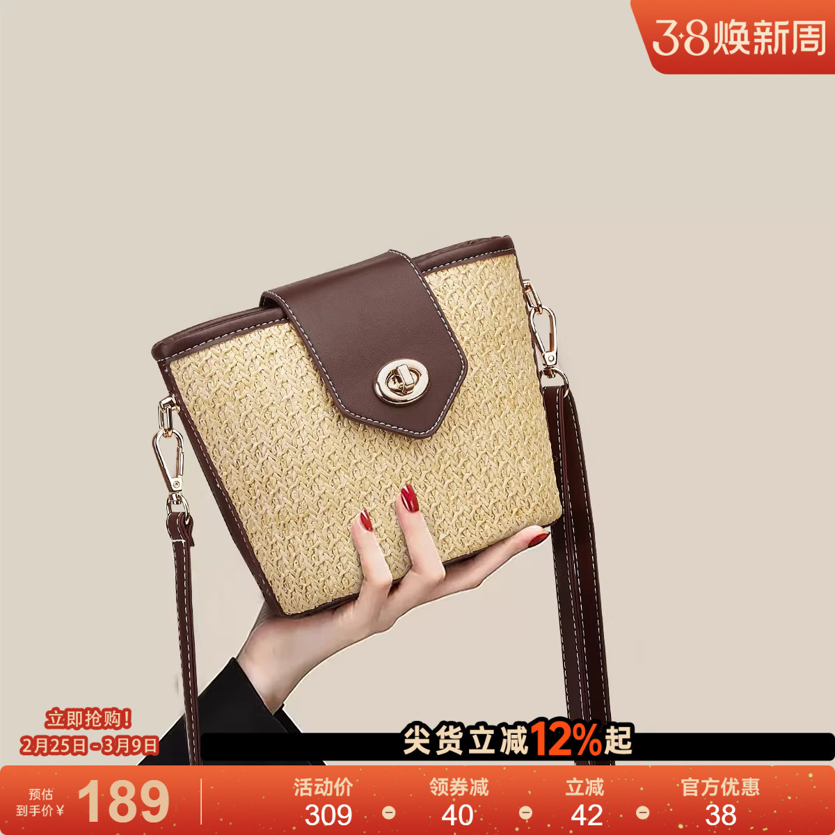 星期六包包女2025新款时尚休闲斜挎草编包百搭小清新编织水桶包女