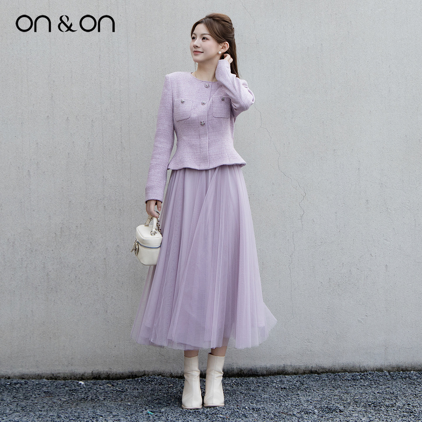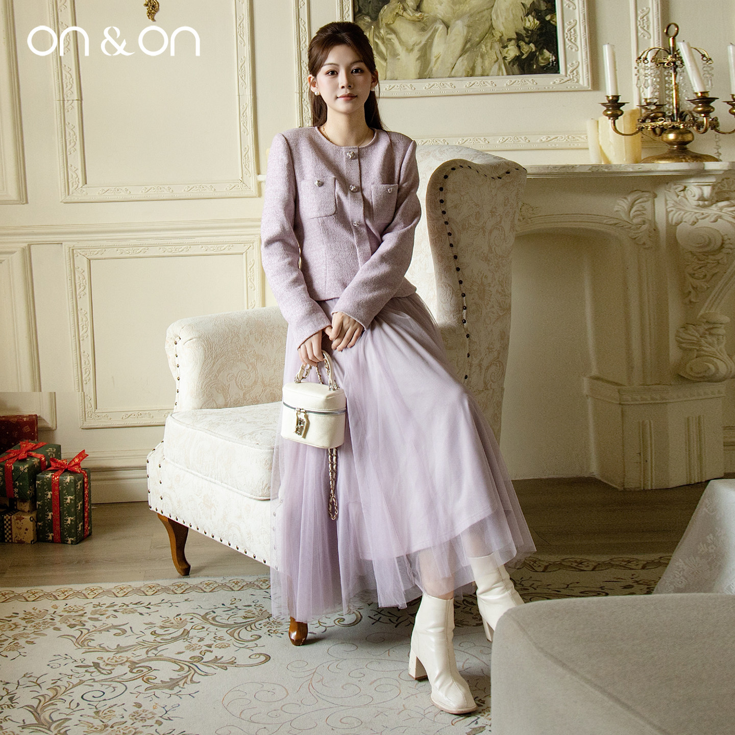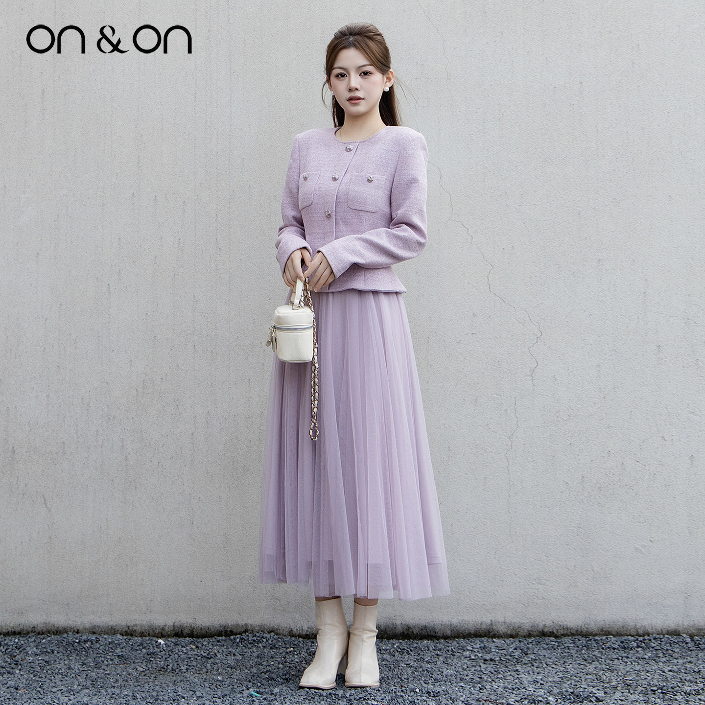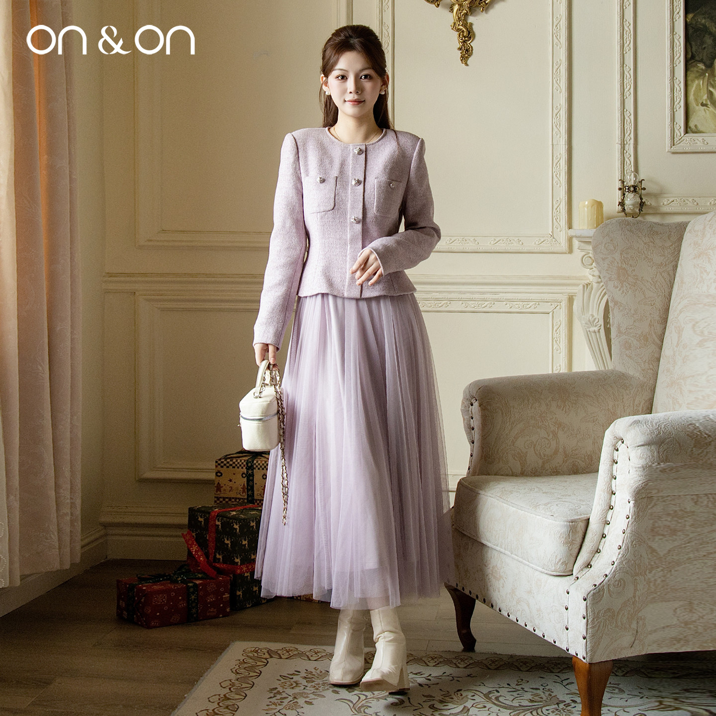 ON&ON/安乃安2025冬季新款法式轻奢气质收腰小香风网纱连衣裙女