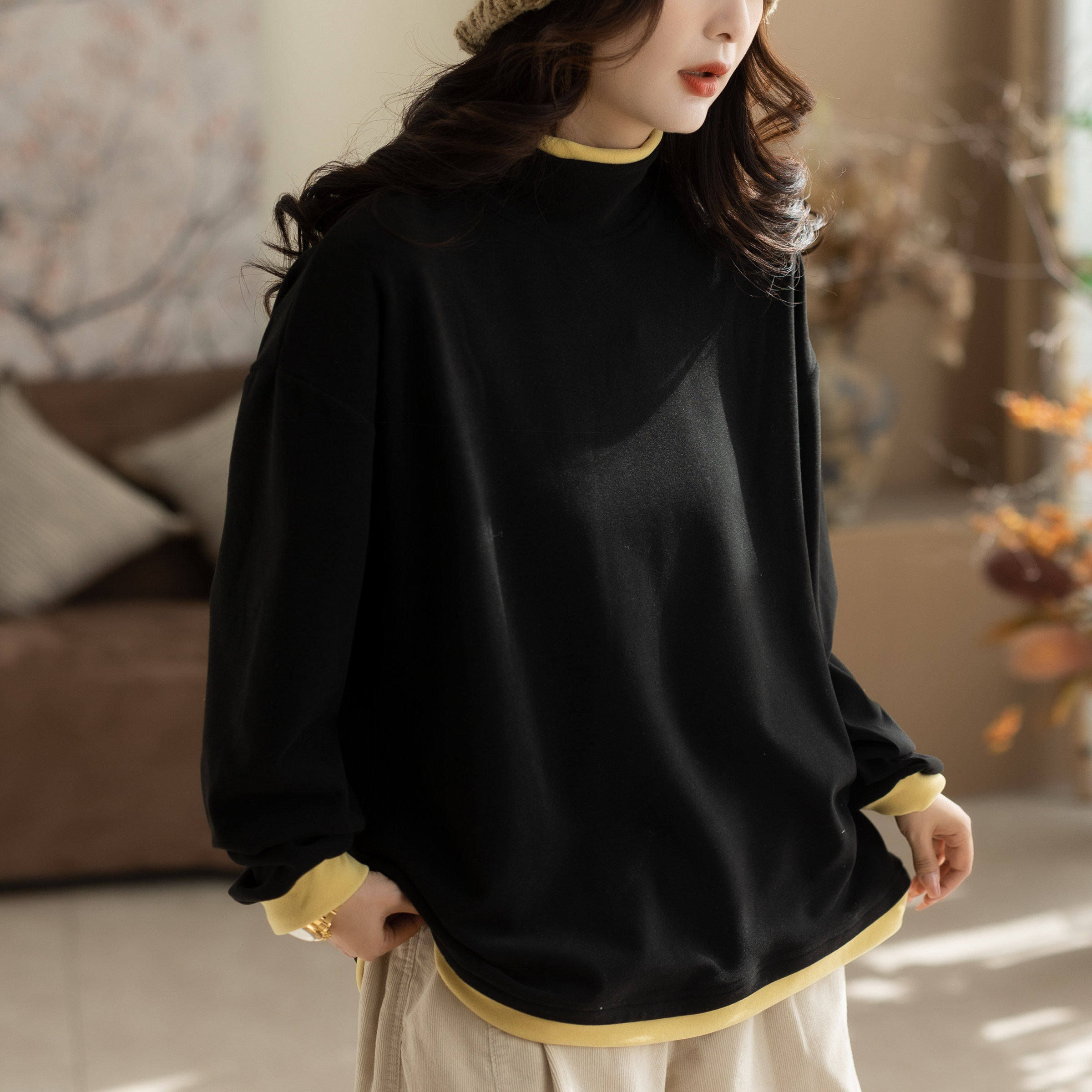 咖咪羽打底衫女秋冬新款高领女士纯色慵懒流行百搭通勤女装上衣