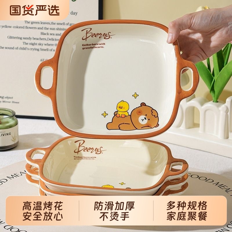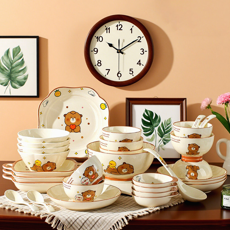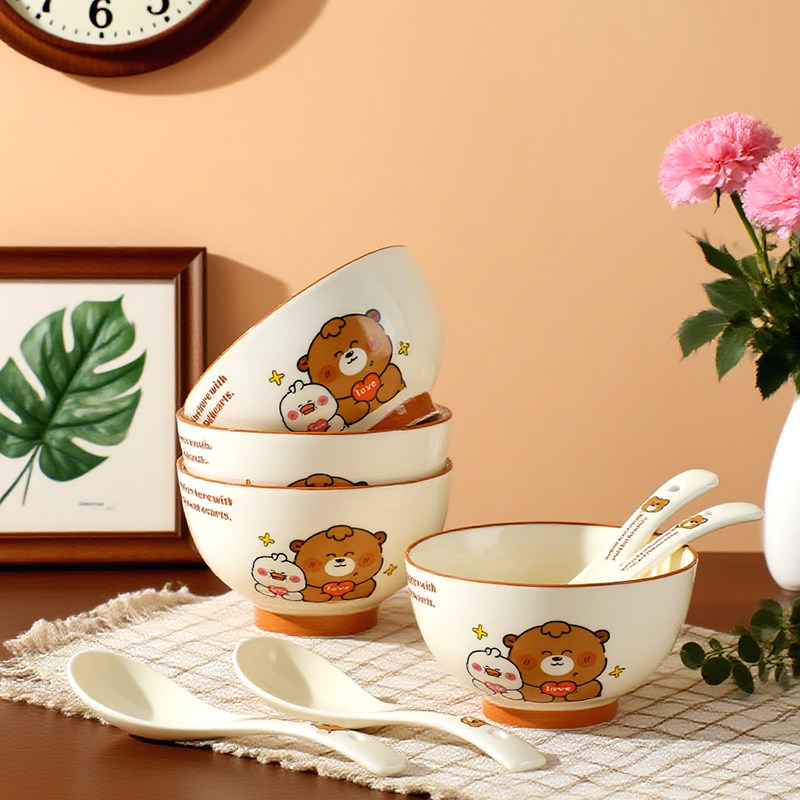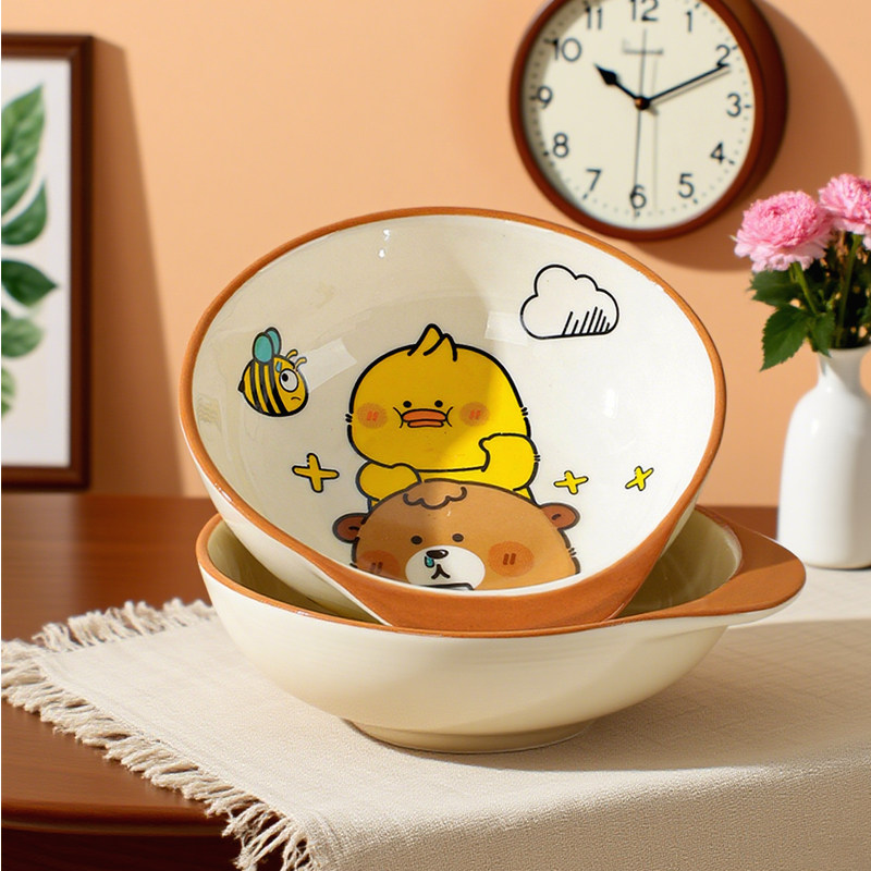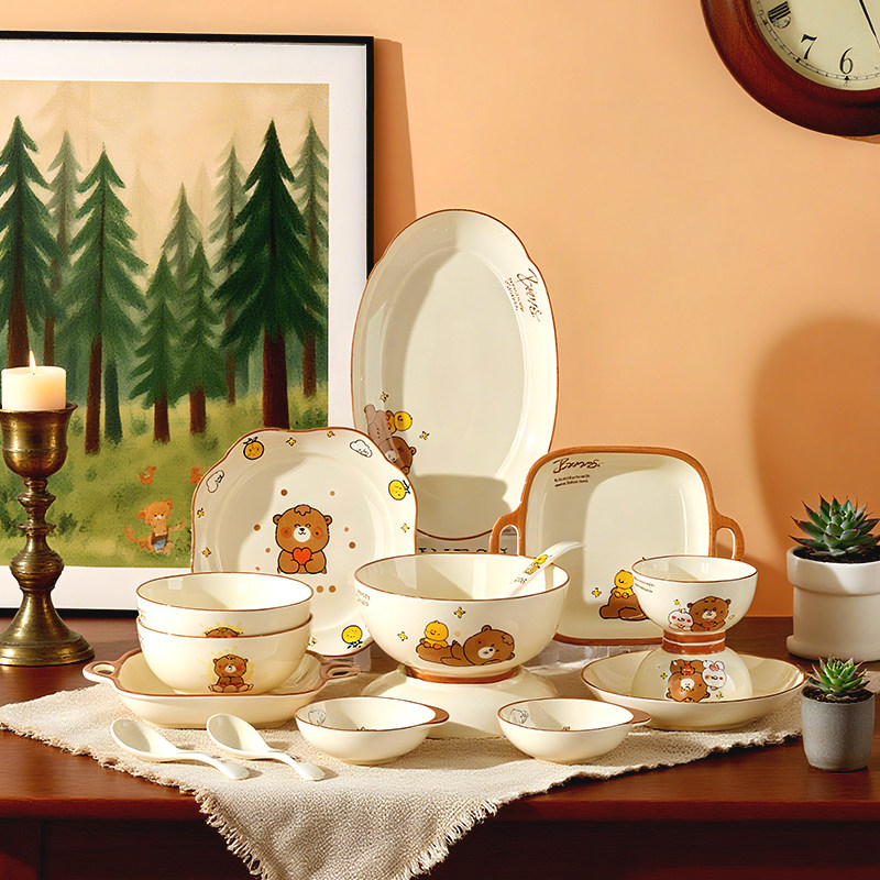 奶油风陶瓷碗家用卡通菜盘子可爱米饭碗汤碗釉下彩儿童餐具耐高温