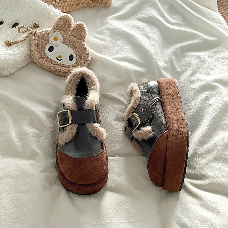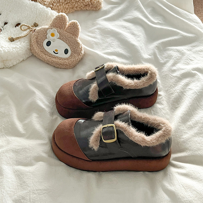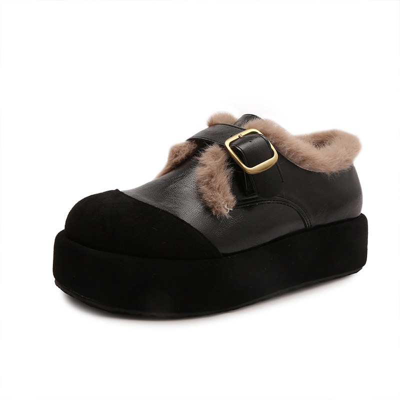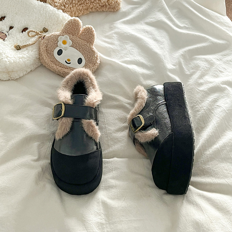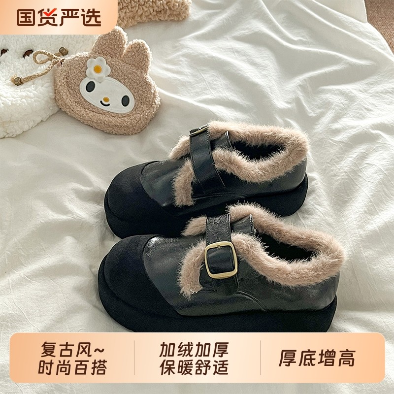 复古黑色加绒保暖勃肯鞋毛毛鞋女2025秋冬季新款圆头厚底增高棉鞋