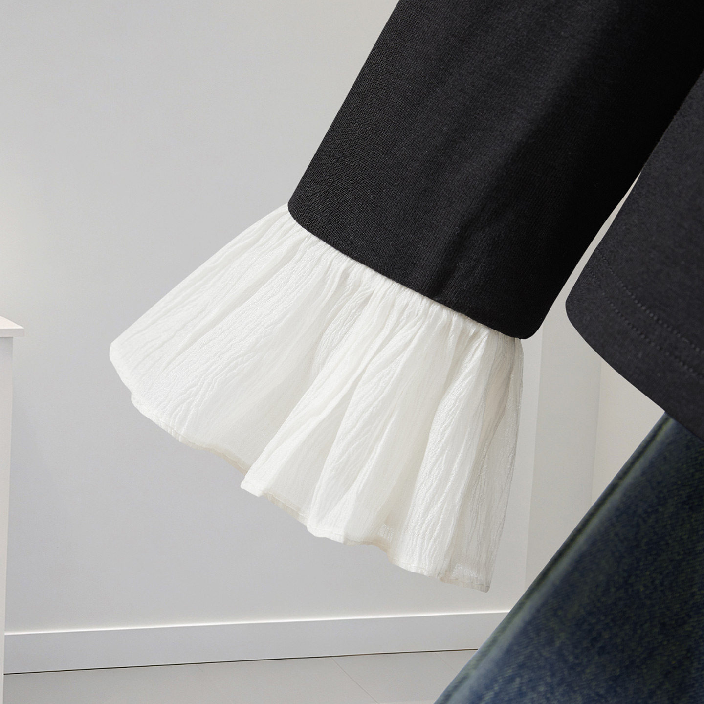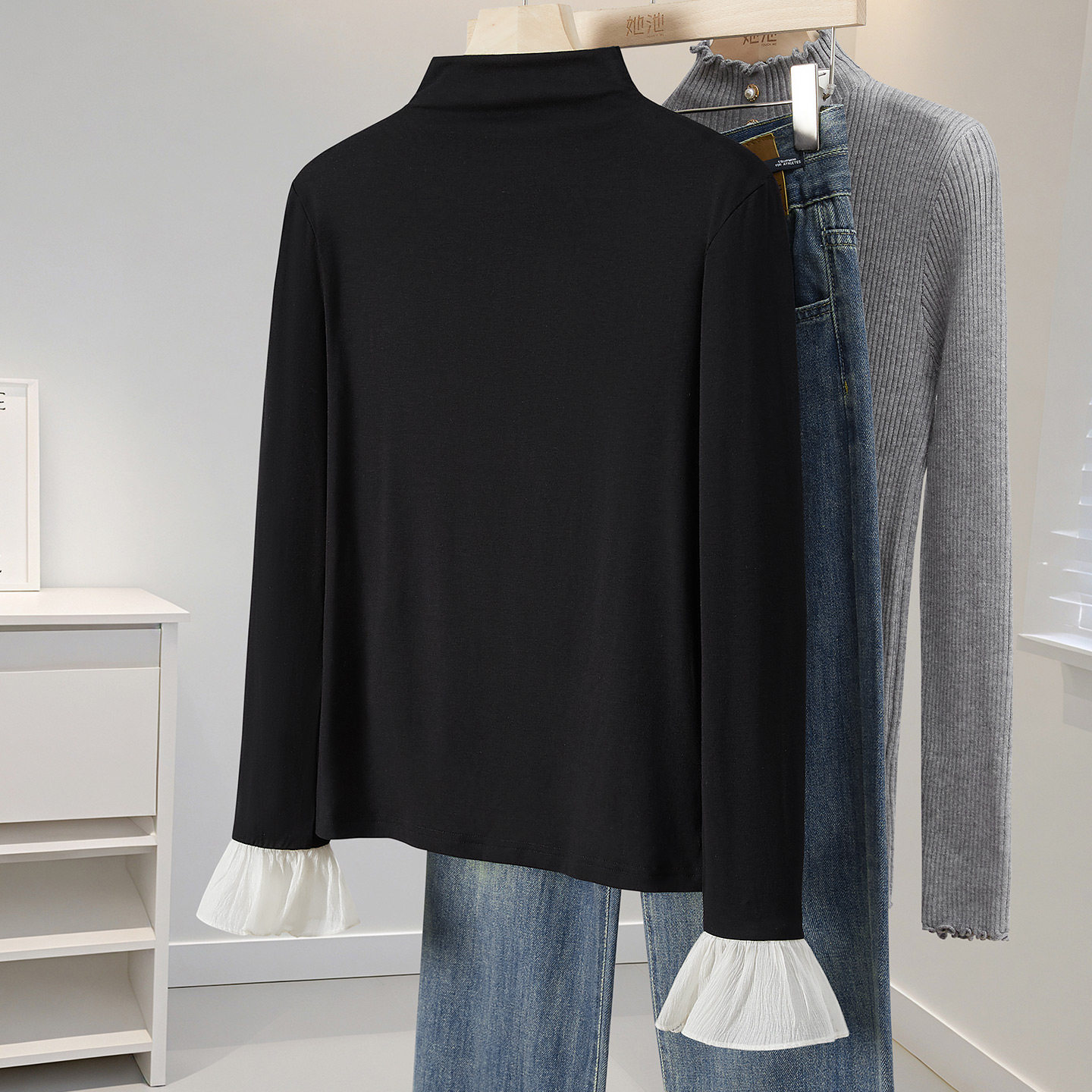 她池半高领打底衫2025秋装新款女装撞色拼接喇叭袖修身套头上衣