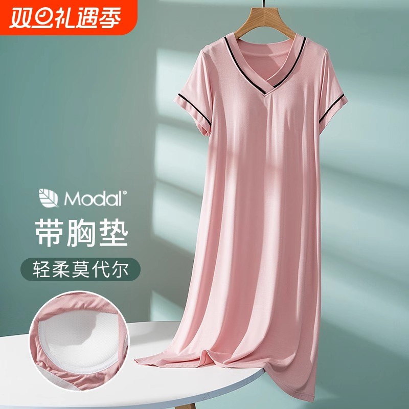 莫代尔短袖睡裙女2025年新款夏季薄款带胸垫连衣裙孕妇睡衣家居服